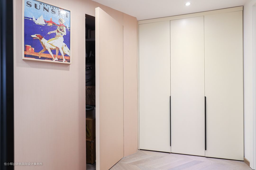 高颜值的玄关承载着收纳和身份转换的功能,考虑到客户还有一些吸尘器一类杂物的收纳需要,设计师利用斜角处做了储藏间。此外,诸如入户鞋柜这样一些细小的要求都一一实现了。#鞋柜#储物间