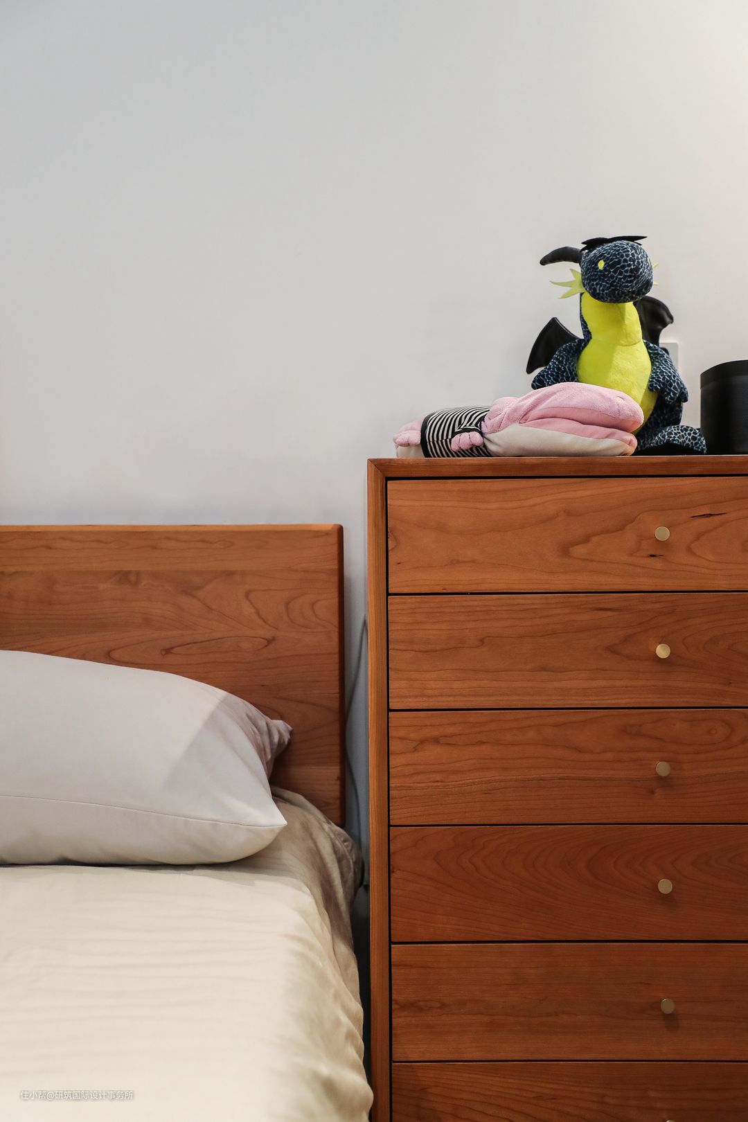 卧室简约而不简单,主以白色、樱桃木色为主,墙面做了分色处理,墙角富有立体感的浅灰色点缀,让墙面颜色富有变化而不单调,搭配樱桃木的主体床与五斗柜,凸显宁静安逸、温润舒适,一副舒适的生活画卷徐徐展开。#卧室#床#斗柜