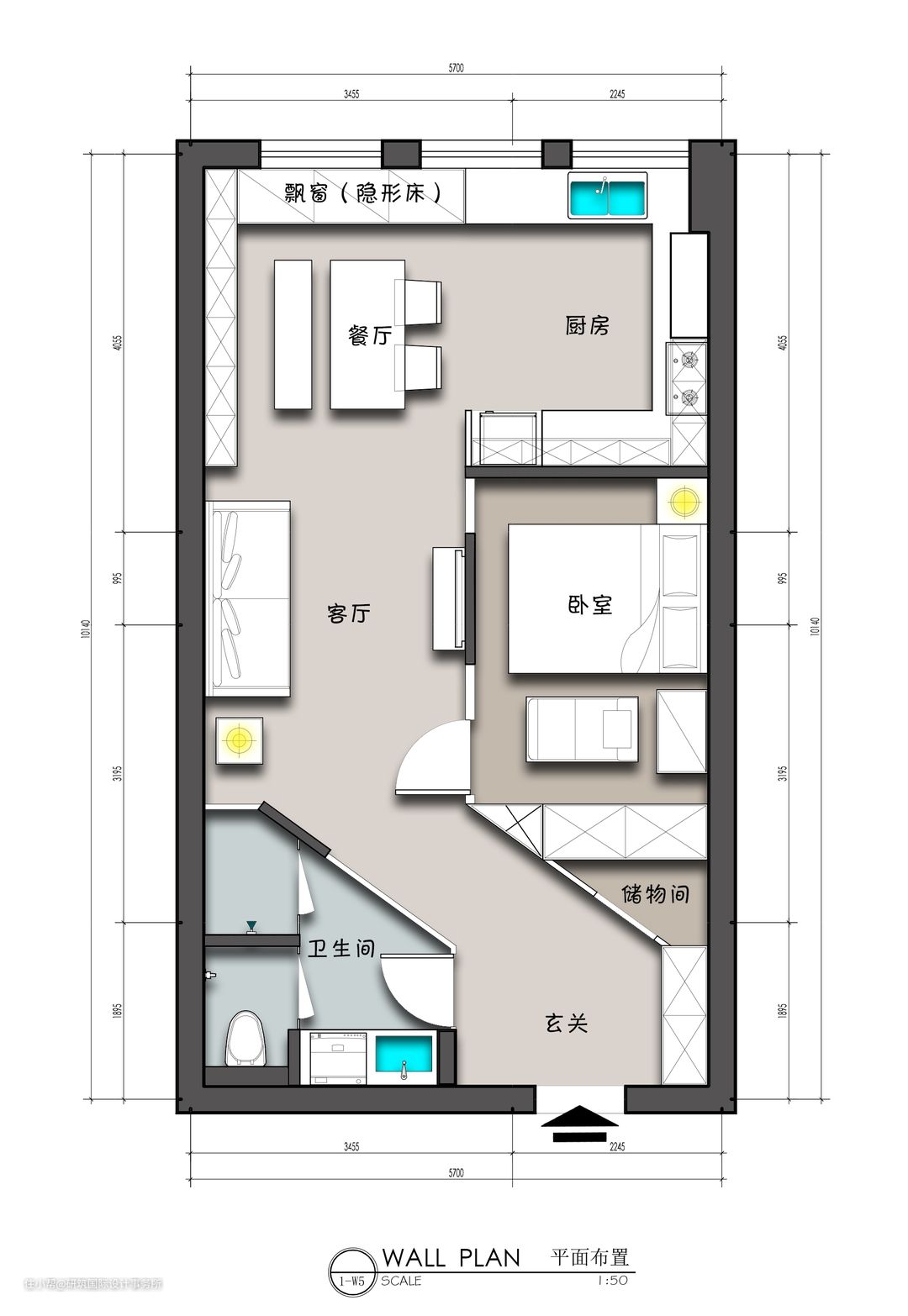 前后经过6稿,最后敲定的这套方案是紧扣“单尺度大”这条设计理念呈现的,在设计师看来,最后这稿方案在每个空间尺度上面来讲都可以与100平的房子相比较。 户型改造具体如下: (1)整个属于长方形户型,原始的缺陷便是没有隐私基础,站在门口便能将整个空间一览无余。如果独立设计一个玄关,对于小户型来说略微奢侈,所以设计师选择将玄关与走廊相结合,做了一个“曲径通幽”的处理,确保室内的隐私性。 (2)将走廊剩余空间做了三角形的储物间,增加储物收纳。 (3)基于玄关走廊的整体的结构,卫生间合理的改造为三分离式,使用便利。玻璃式的墙体,增加空间的通透性。 (4)卧室重新划分,利用玻璃的形式,让空间明亮舒适。 (5)客餐厅、厨房一体化,视觉上空间更大,动线方面也更加流畅,同时保障空间的采光。由于空间面积的问题,客厅无茶几设计,活动更自由。 (6)餐厅由书架、餐桌椅和飘窗组成,同时也是男主的办公区,满足男主的藏书需求,飘窗的作用在于隐藏折叠床,可以作为餐椅,休闲、看书、办公。 (7)开放式的U字型厨房格局,开间2m活动自由,高低台的设计,嵌入式的电器,满足日常生活的便利。