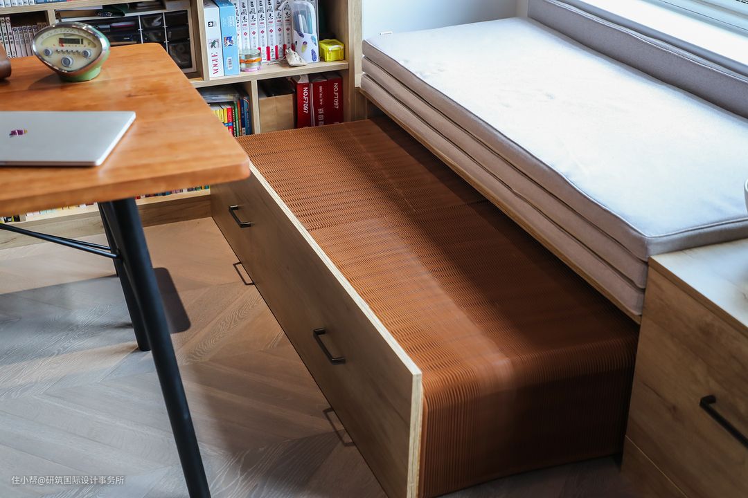 多功能餐厅,承包了书房、餐厅、临时居住区集于一体,在采光极佳的地方,设计了飘窗的位置,飘窗的设计则是这个空间最佳的亮点,一方面营造轻松的氛围,另一方面特殊五金件的抽拉式的纸床,方便家人探亲居住。#隐形床#飘窗