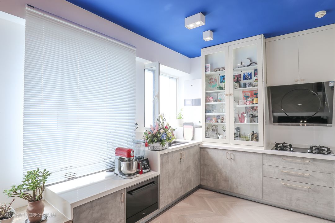 靓丽的宝蓝色顶面处理,大大增加了空间的视觉冲击力,带来视觉上的清爽,清凉过渡一夏。 由于空间格局,客厅放置茶几,会显得空间局促,活动起来不便,再加上业主平常在客厅待得时间不多,所以最终不设茶几,若后期需要,可购买小型轻巧的茶几,也是比较方便的。#客厅#沙发#电视柜