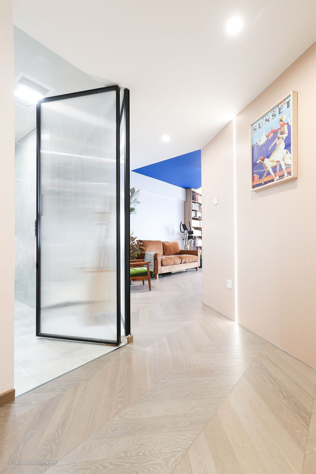 映入眼帘的玄关,视觉呈几何形的长廊形式,拉长空间的纵深感,“曲径通幽”的处理手法,确保了室内隐私性的同时,让空间更有神秘感。#玄关#走廊
