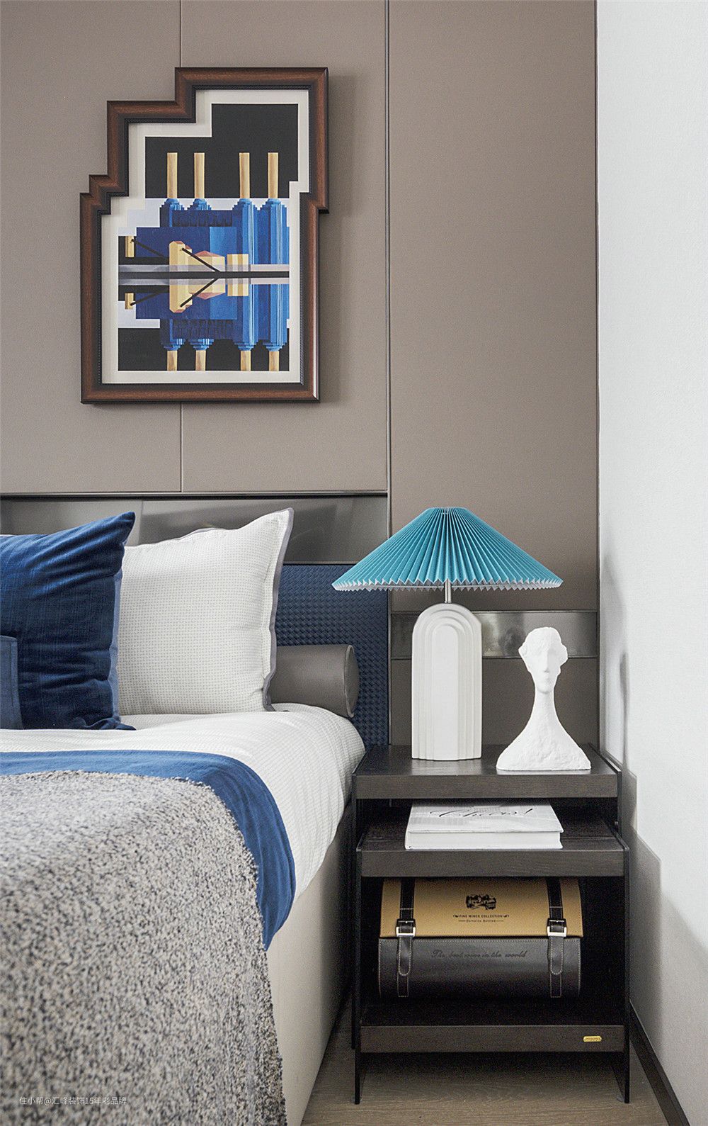 主卧空间以灰棕为主要色调,营造安静舒适的居住氛围,蓝色在空间中的局部点缀,增添空间的色彩层次;特别定制的BV编织纹床背体现了设计师对品质细节的高要求,黑色水磨石边吊高低错落,为简约背景增添层次感。