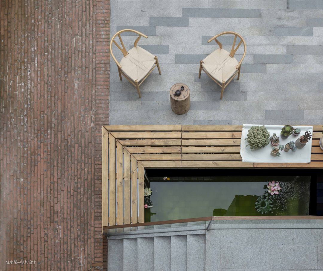 一层,在庭院的鱼池边,种一棵树,老人们可以坐在鱼池边喝茶