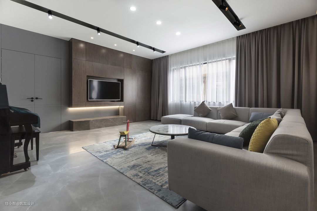 电视背景墙实际是带储物功能的,门板都用按弹的方式打开,这样保留极简的视觉观感的同时又具有储物功能,电视背景墙的右边是一个隐形门,安装了闭门器,所以不用门锁拉手