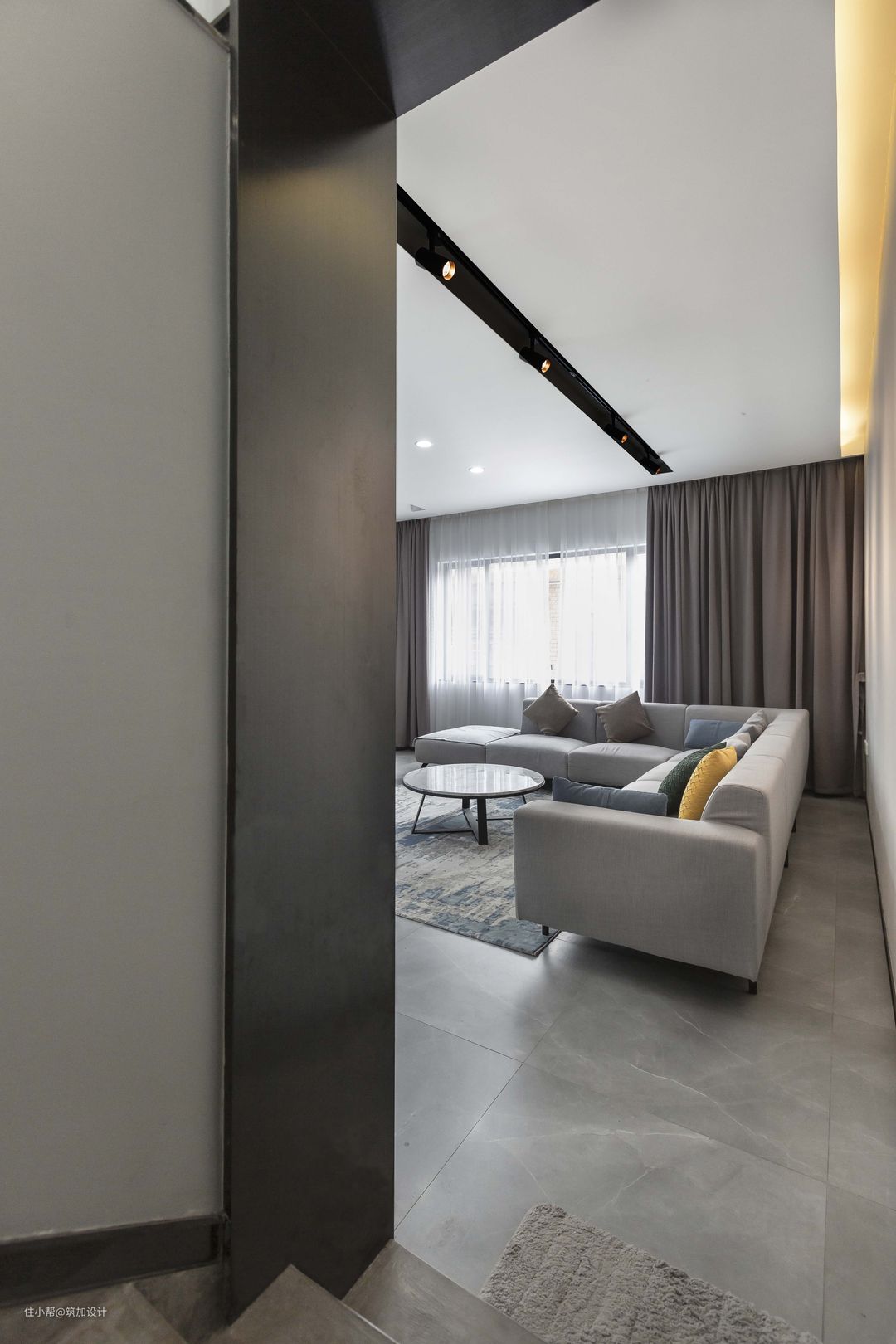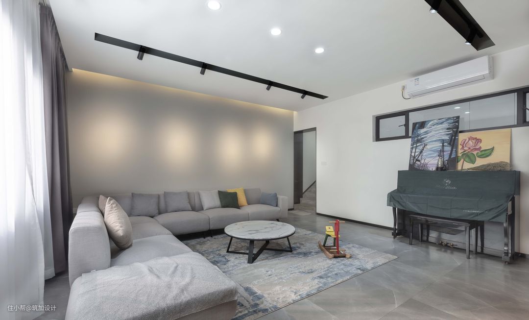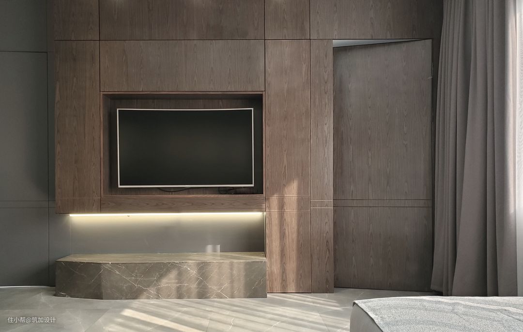 电视背景墙实际是带储物功能的,门板都用按弹的方式打开,这样保留极简的视觉观感的同时又具有储物功能,电视背景墙的右边是一个隐形门,安装了闭门器,所以不用门锁拉手