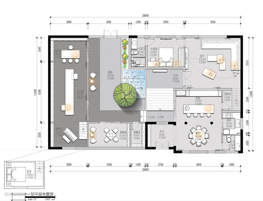 一层,在庭院的鱼池边,种一棵树,老人们可以坐在鱼池边喝茶