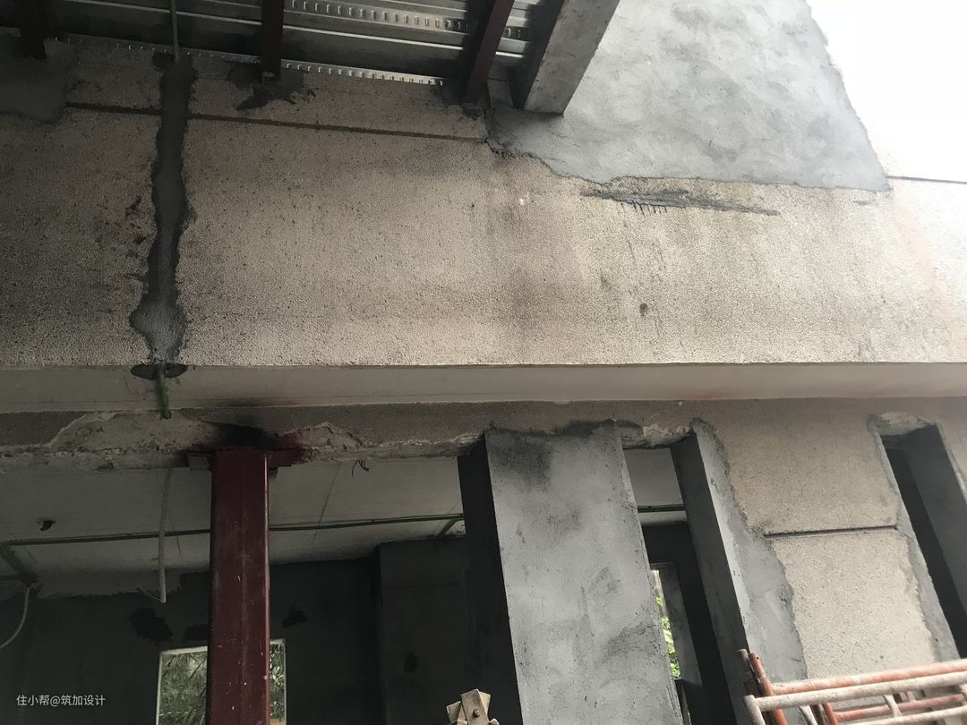 这两根铁锈色的柱子,是两根钢柱,先刷防锈漆,批腻子然后在刷铁锈漆,原设计是圆柱贴木饰面,因柱子的直径不大,贴木饰面难度大,造价很高,所以改成了现在的圆角方柱然后上铁锈漆。