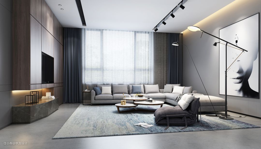 电视背景墙实际是带储物功能的,门板都用按弹的方式打开,这样保留极简的视觉观感的同时又具有储物功能,电视背景墙的右边是一个隐形门,安装了闭门器,所以不用门锁拉手