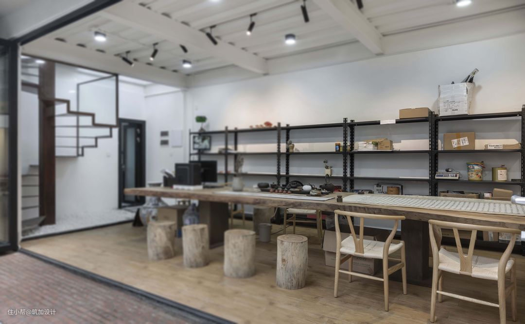 工作室,原来我们建议业主的预算分配是:这个长桌用两块木头,一整块的大木头太贵了,包括运费都会贵很多,两块木头效果也不差,节省一些预算用于购买后面的货架,我们在淘宝已经找了物美价廉的货架,就是那种在咖啡厅经常能看见的工业风的,然鹅,结果就是你们看到的这样,业主看到了一块大木头,太喜欢了直接买了,然后后面的货架只能砍掉一部分预算,所以,这个货架就是一个真正的货架。