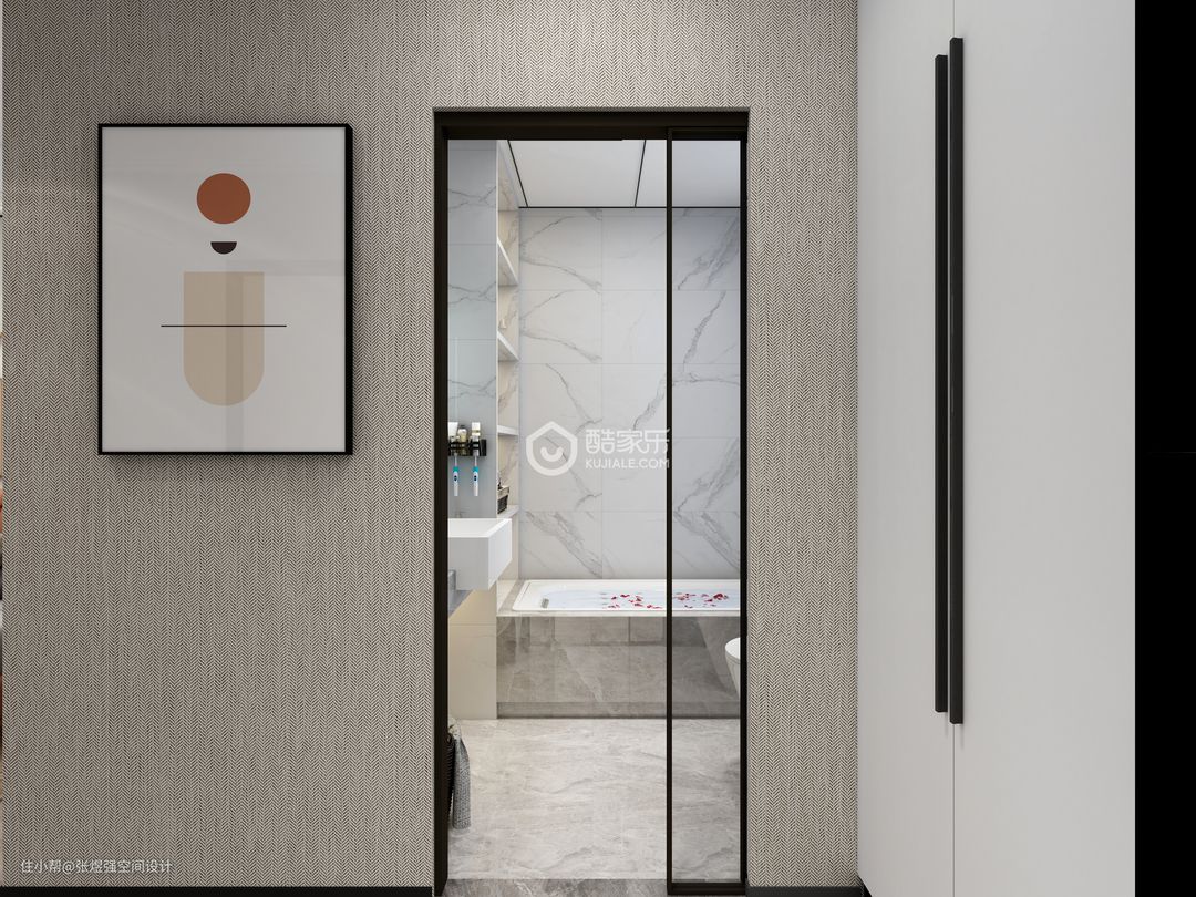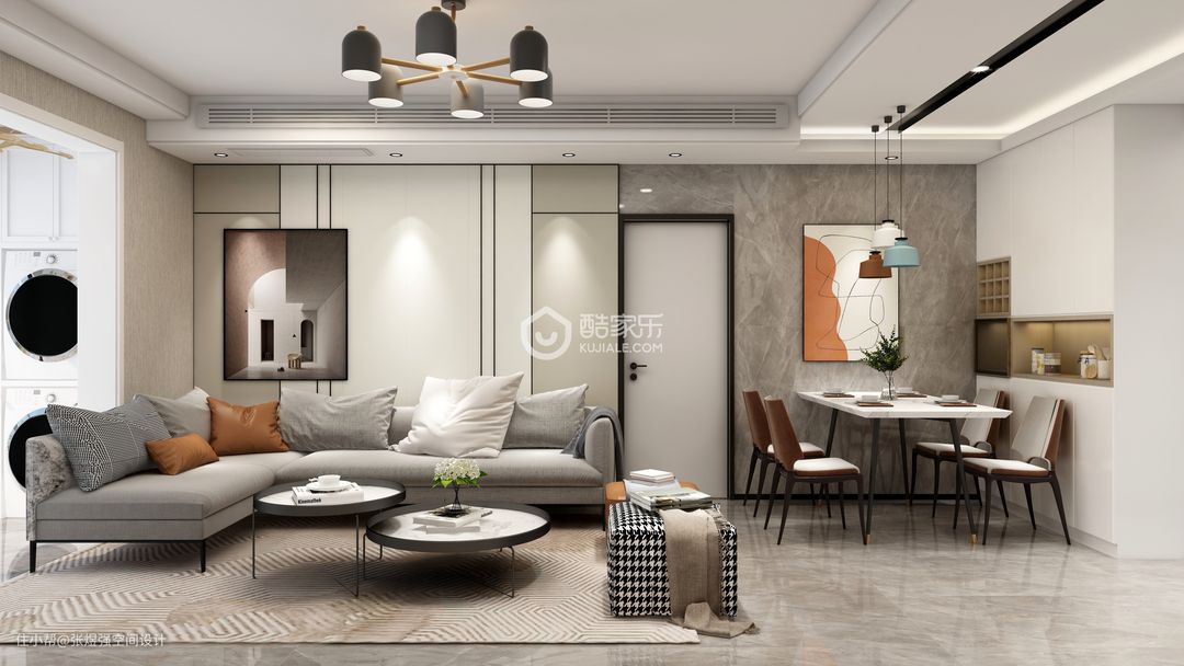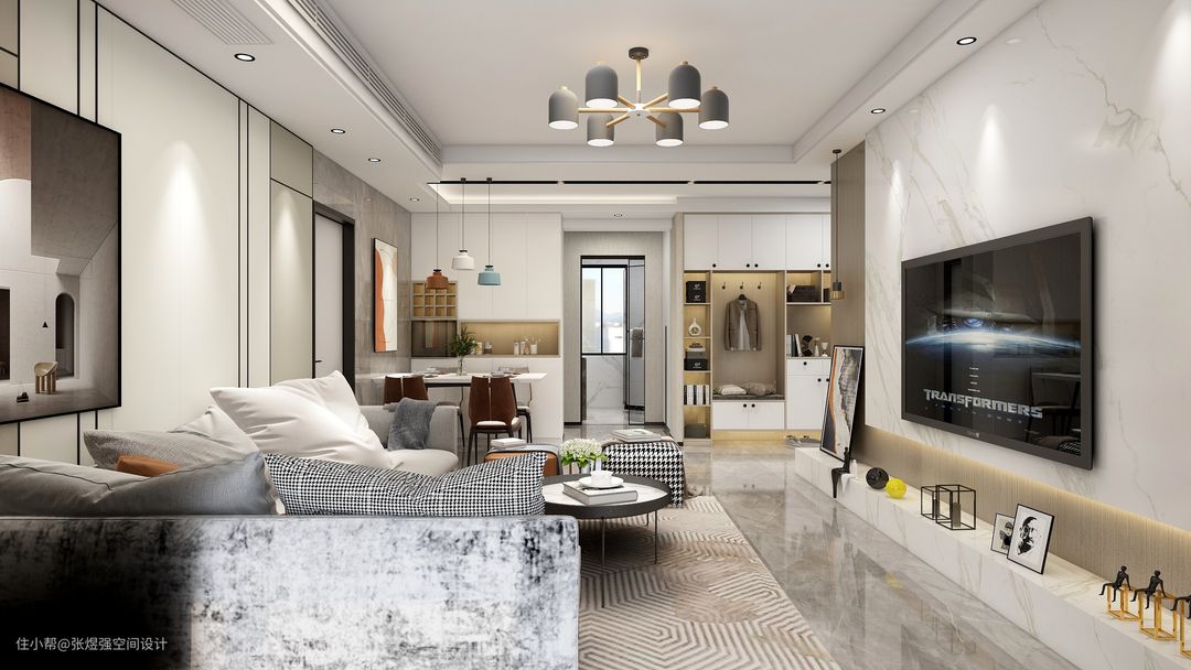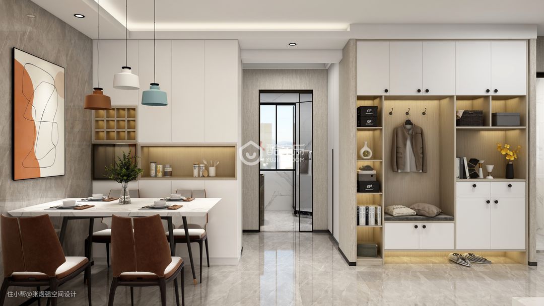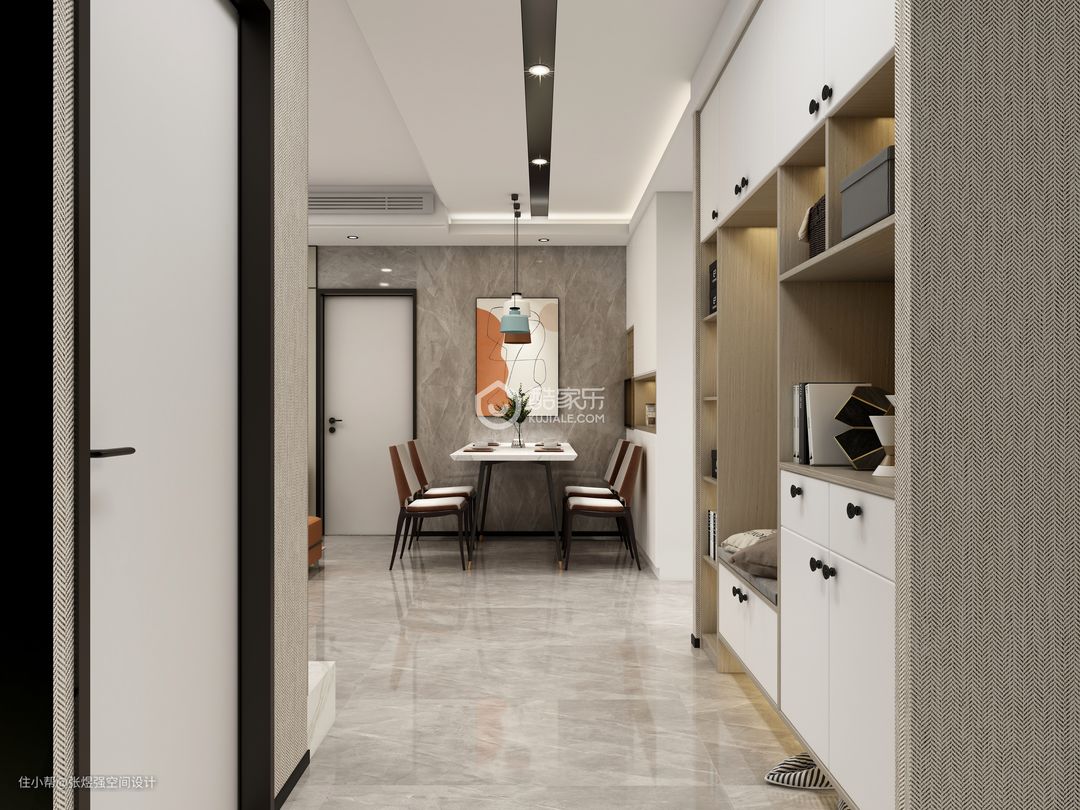 本案在一层,业主三口之家常住,所以户型局部调整,取消一个洗手间,洗手间也压缩了面积,增加了储物空间,餐厅稍微调整,增加了餐边柜和增大了餐厅面积,打通阳台,直通花园,整体以现代简约为主,作为地暖层高才2.65,简单吊顶,房间几乎没吊顶。背景墙稍微有点造型,由于采光一般,所以几乎以浅色为主,局部点缀亮色。