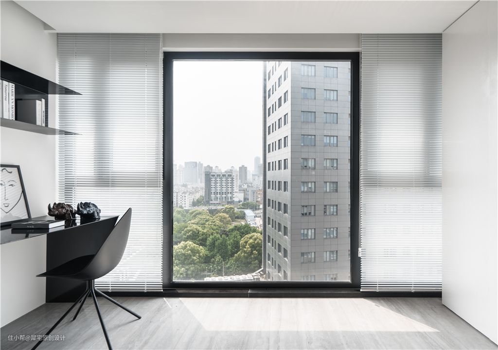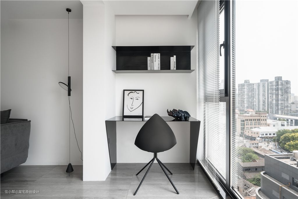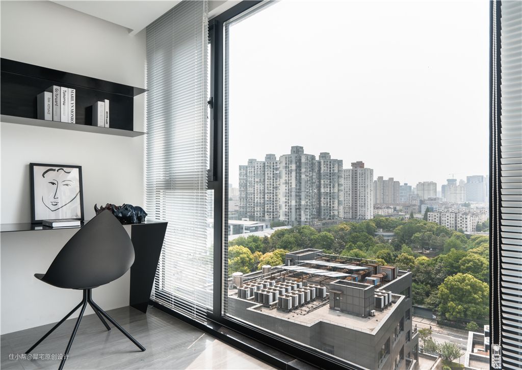 书房也延续黑白极简风格,采用定制铝板制作书架、书桌。