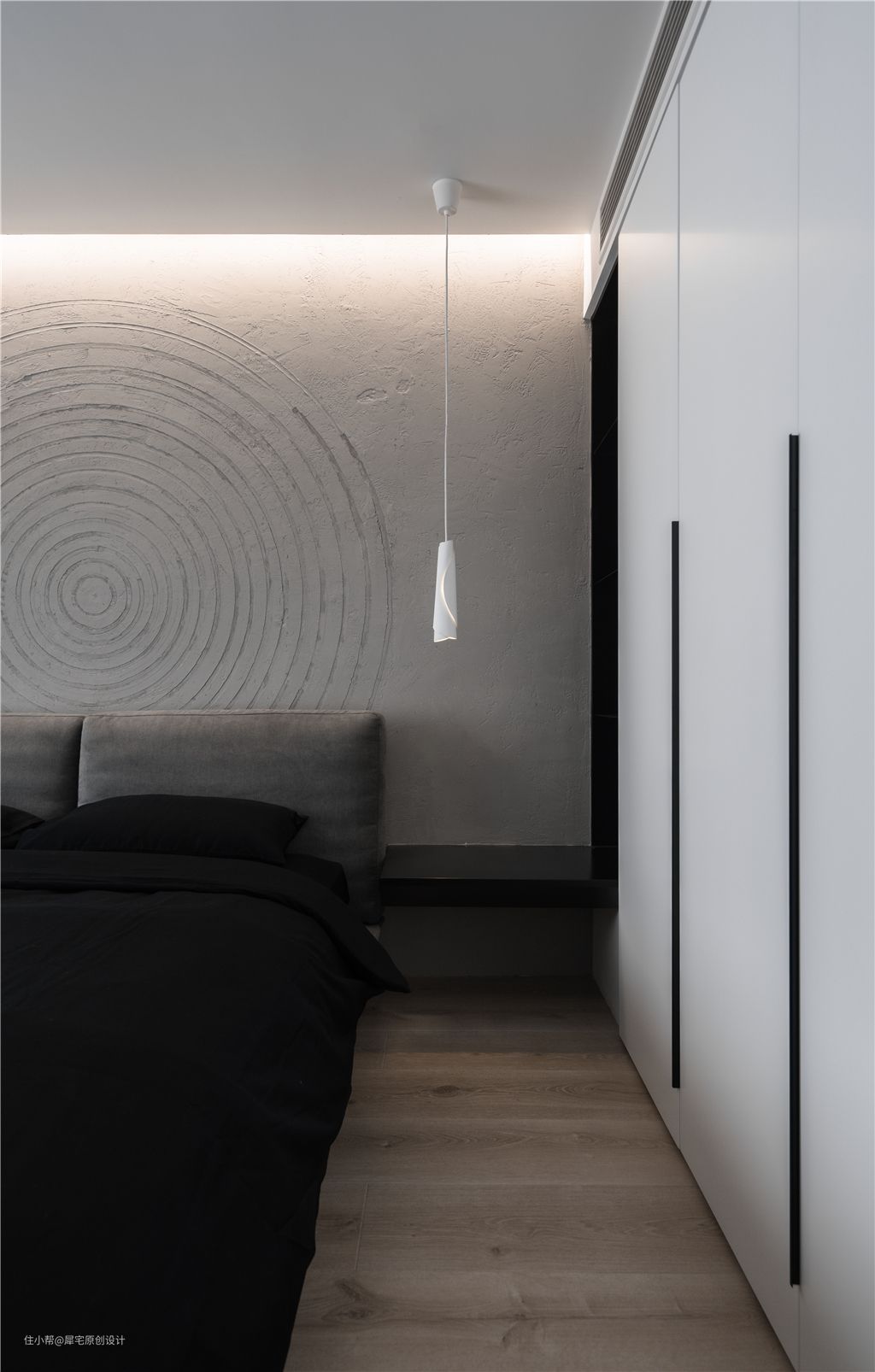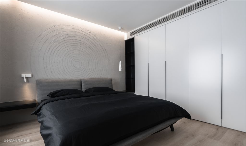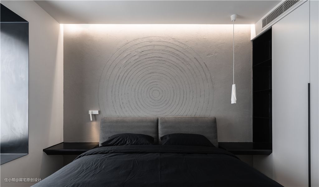 用硅藻泥做出的装饰背景,简洁环保。床头隔板正面做一个倾斜的切面,视觉上会显得更轻盈一些;