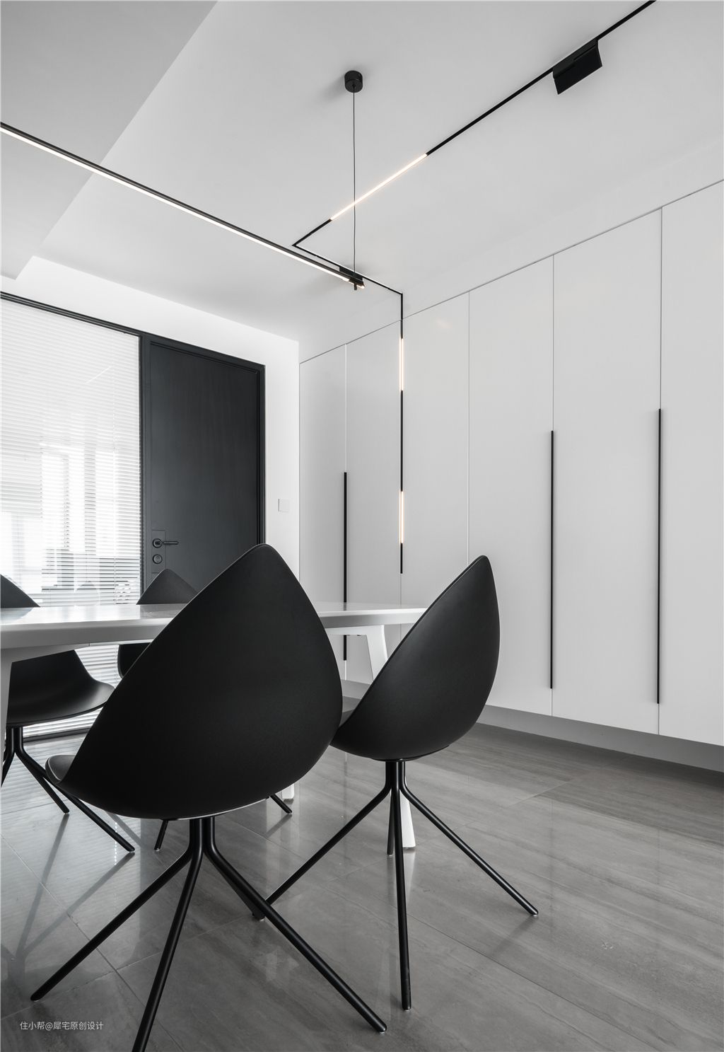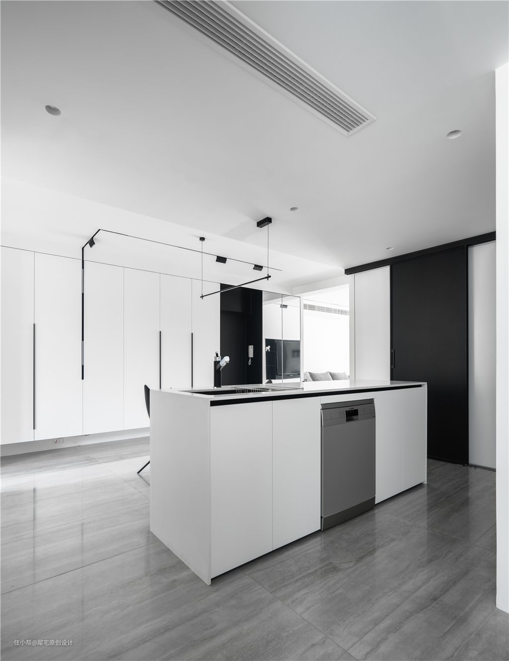 在整个空间基调上,本案主要以黑白灰的色调及各种灯光的配合去呈现出来的。进门过道从顶到鞋柜上的磁吸灯,起到一个空间区域的指引和柜体照明作用。