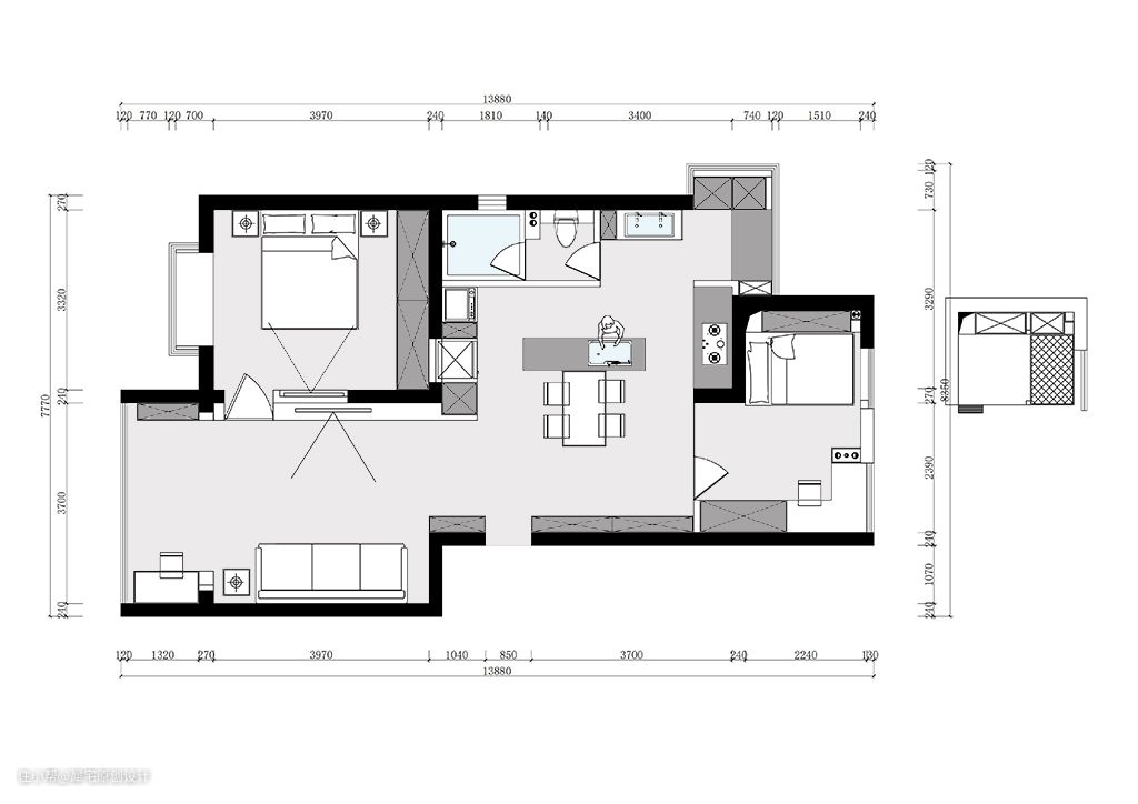 改造的中心思路是以餐厨为中心,客厅/房间/卫生间围绕式包围餐厨空间,将次卧室打开变为开放式厨房区域,原本通厨房的过道还是保留作为餐厅及鞋柜区域。