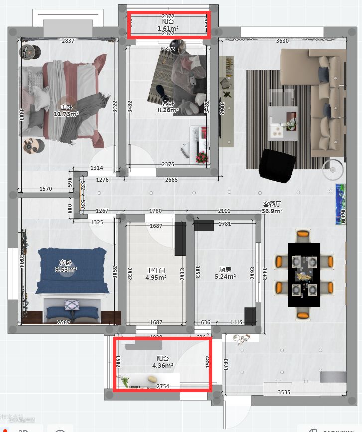1.在原有的户型上,外扩了室外阳台变为室内阳台,更换了断桥隔热铝型材窗户,原阳台地面增加地暖铺设; 2.在原有的采光房改成了储物间,新增洗衣机位置及上下水,增加断桥隔热铝型材窗户,原地面也增加地暖铺设; 3.卫生间坑距在原有的基础上用移位器向右移动20公分,方便淋浴间使用; 4.整个方案采用现代简约风进行设计,增强储物功能及实用功能。