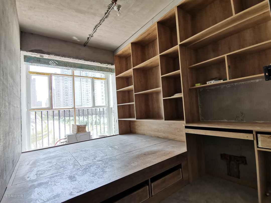 这图可以看到改掉的阳台,封闭的断桥隔热铝型材窗户,阳台晾衣架,榻榻米、书桌书架基本完美的结合在一起。