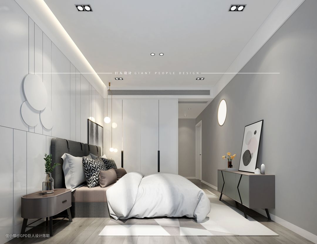 主卧营造一个高级整洁的感觉,整体是一个黑白灰色调,特意做了个圆形嵌墙夜灯,配以深咖色的木作,展现主人品味。