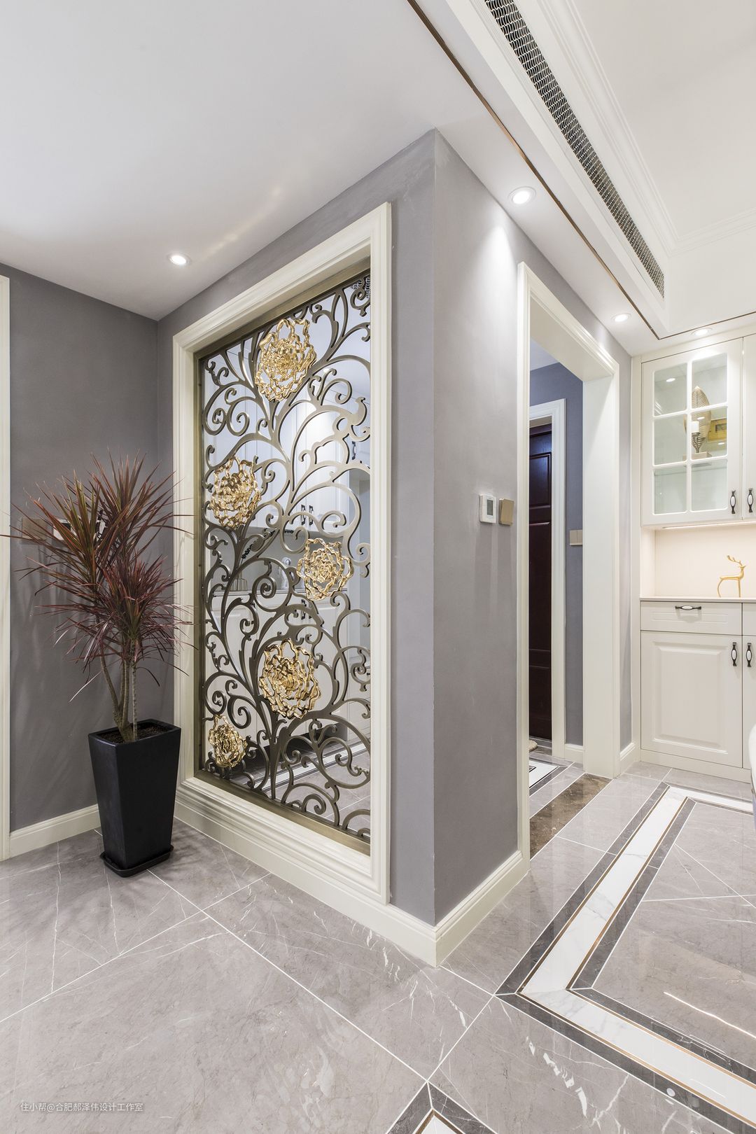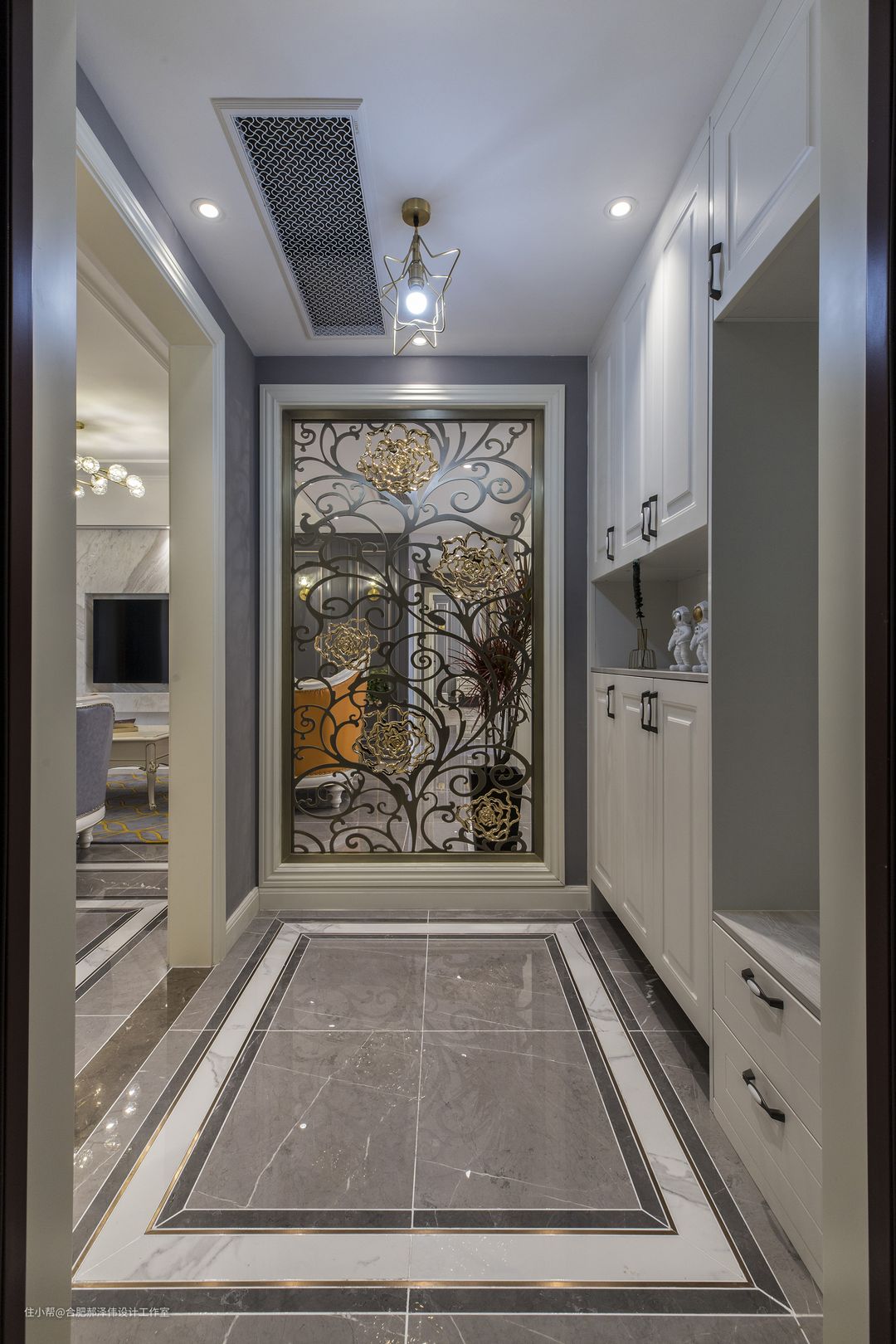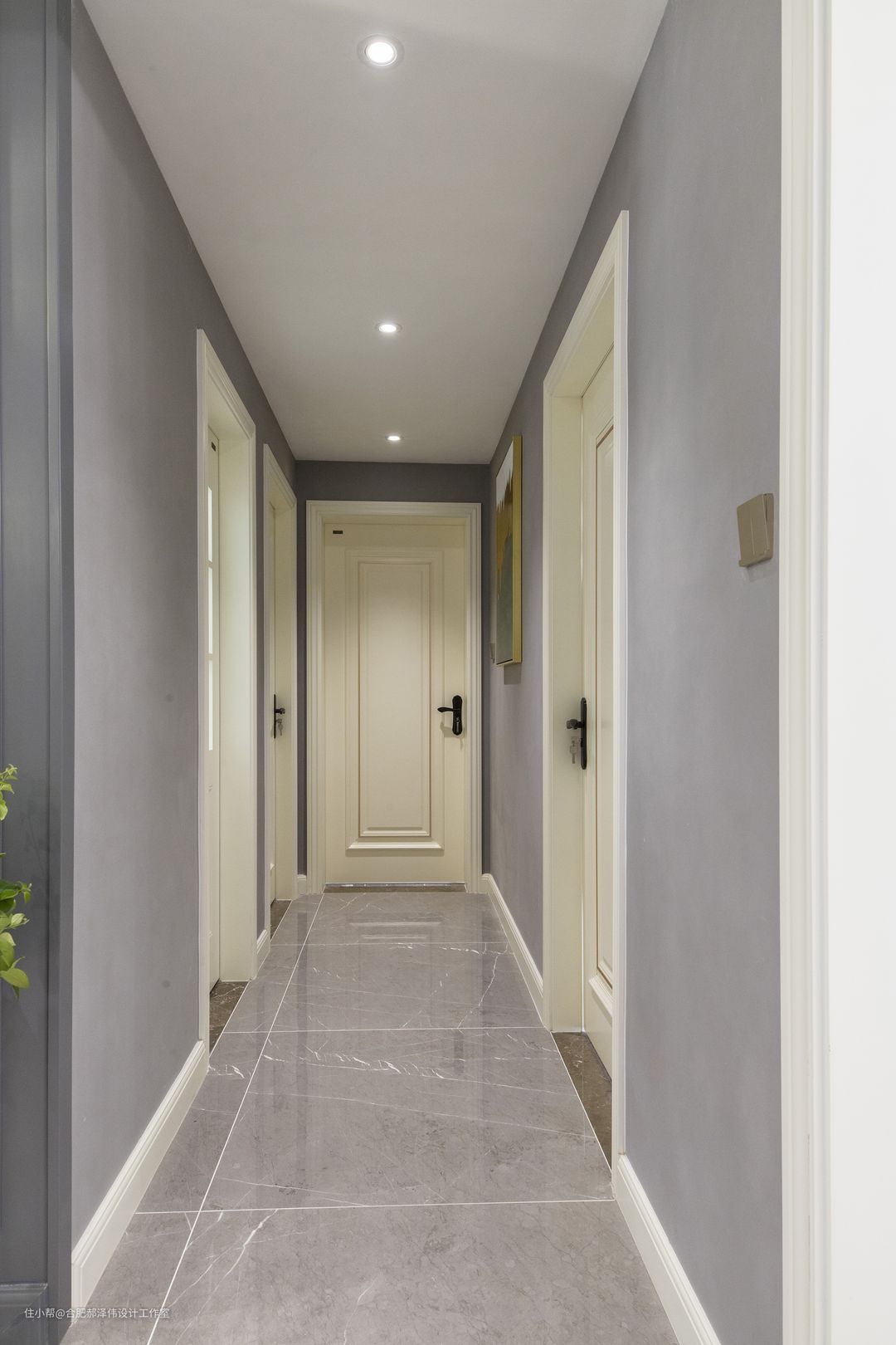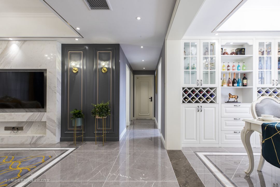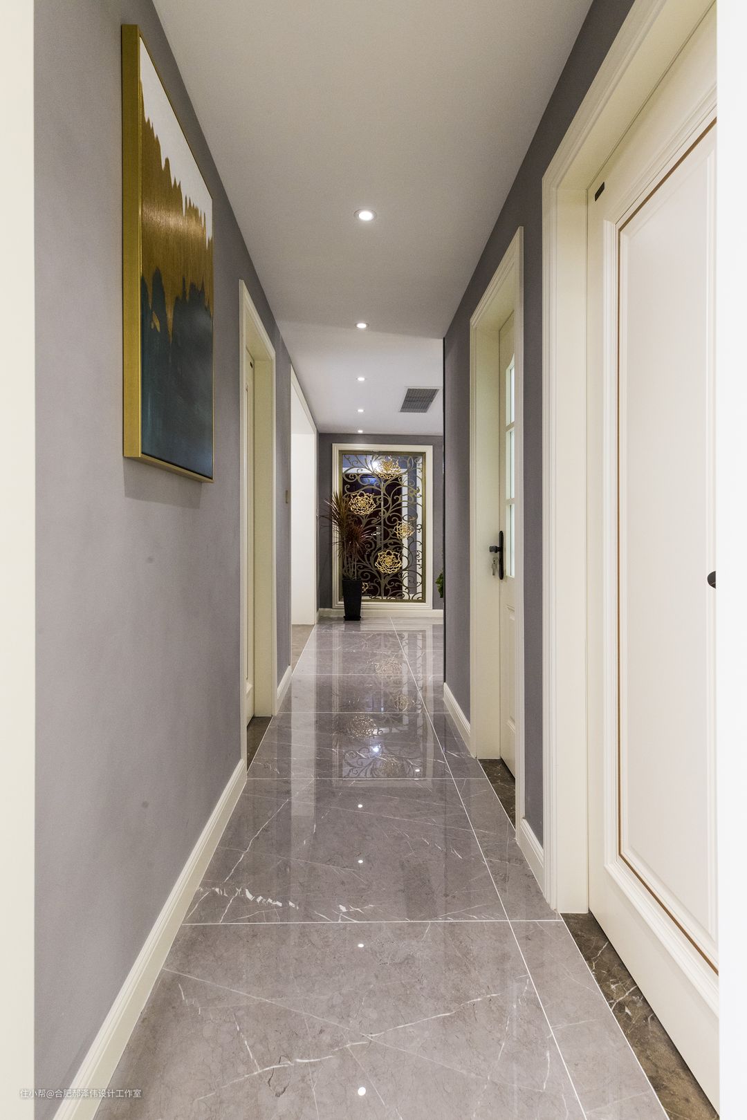 走道看玄关,卧室门也镶嵌了铜条。统一风格,延续轻奢元素。