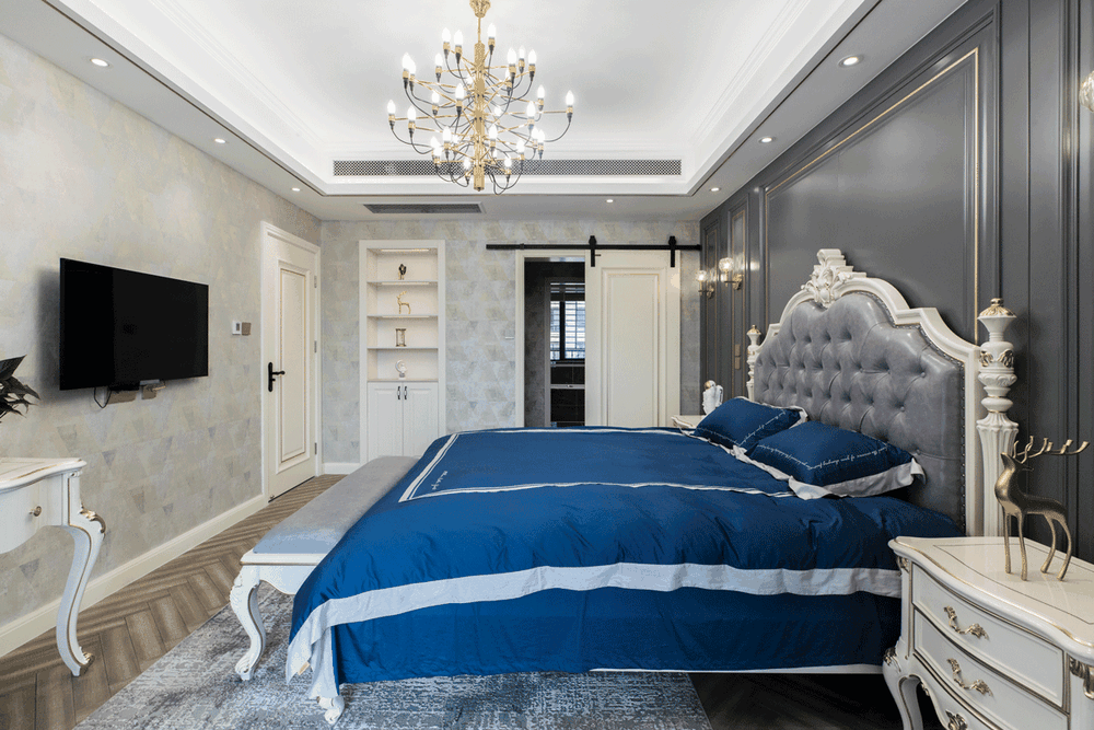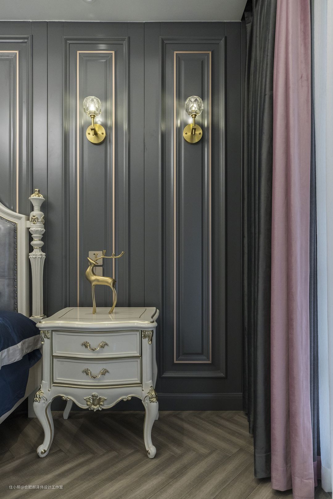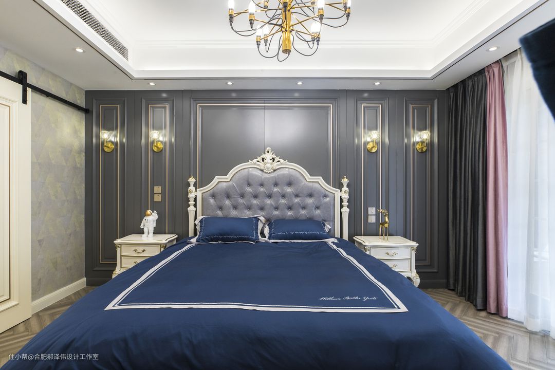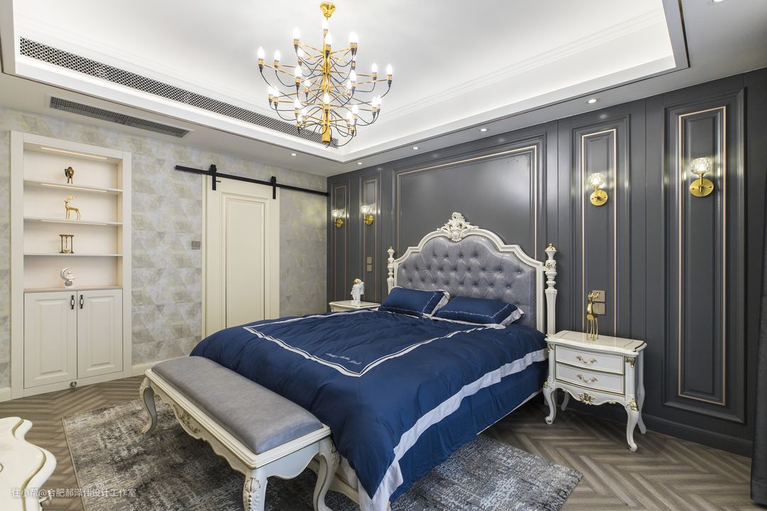 主卧室延续公共空间的灰白基调,定制灰色护墙板,地面浅灰色实木人字拼地板搭配浅灰色墙布, 家具也延续了白色烤漆和灰色皮质和组合,在加入一些描金的线条处理,更契合轻奢主题。 墙面卡条、顶面卡条、吊灯、壁灯都是轻奢元素的体现。 实木地板:富得利地板 木门:顾友木门 家具:欧美家具