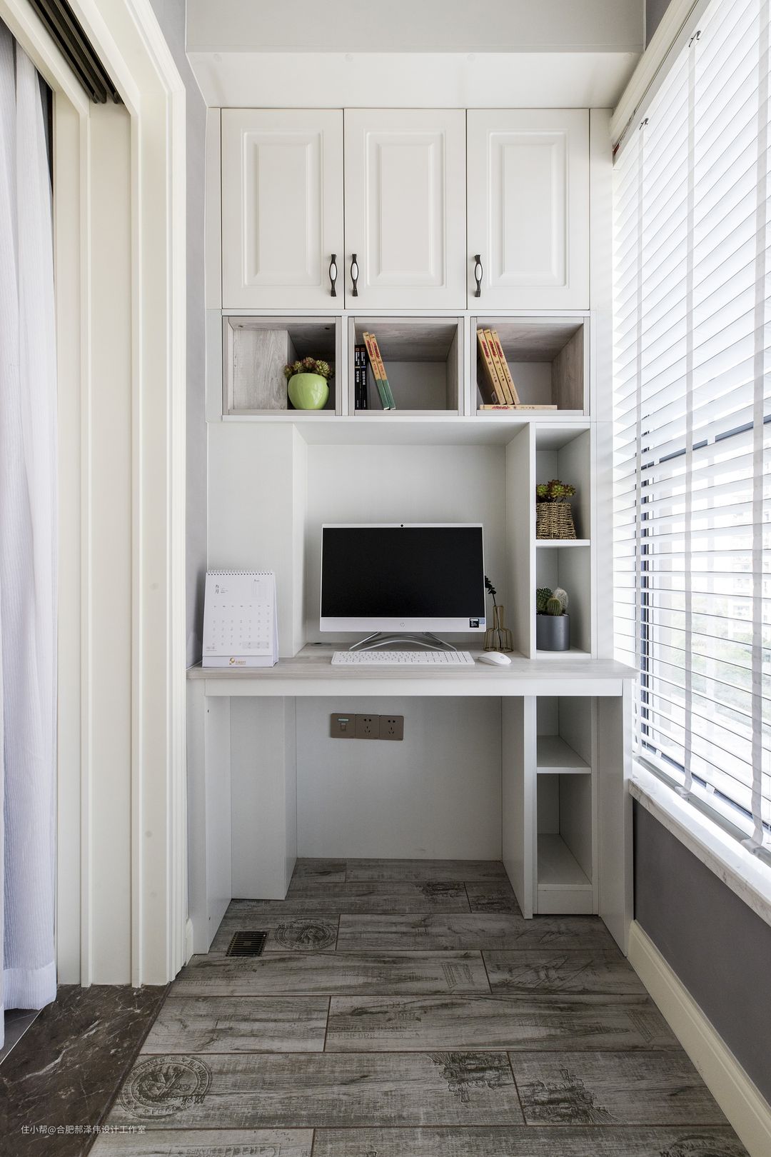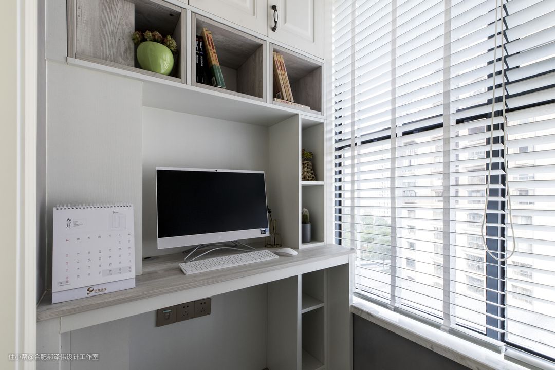小书房 男业主有时候晚上会在家办公,虽然客厅后面就是敞开式书房,但是男业主希望晚上自己办公不影响宝妈在客厅带孩子、嬉戏、看电视。 所以我们开辟了“第二战场”,把狭长的北阳台一分为二,一边做为休闲阳台,孩子爸放了台跑步机,另一边就作为自己的私人小书房,晚上的时候推拉门关上就是自己的一片天地。办公、游戏、看电影互不干扰 窗户还安装了木百叶,可以根据需求,调整光照亮度。