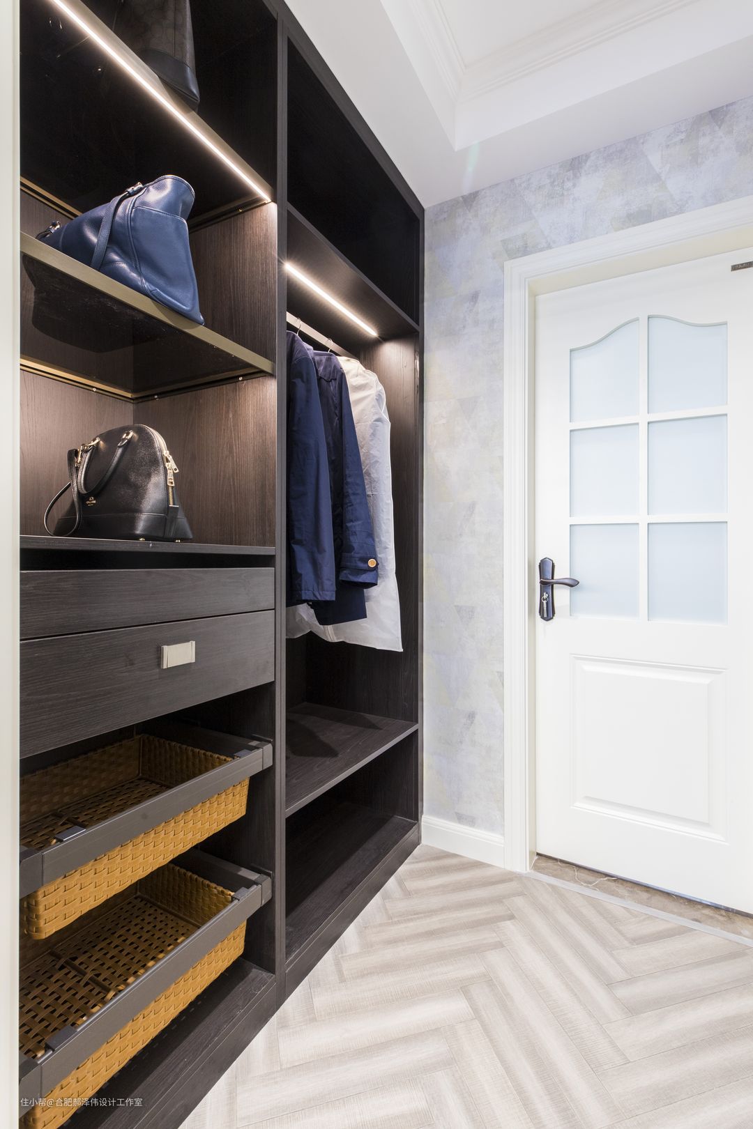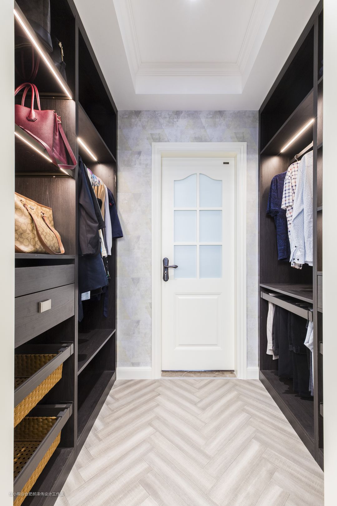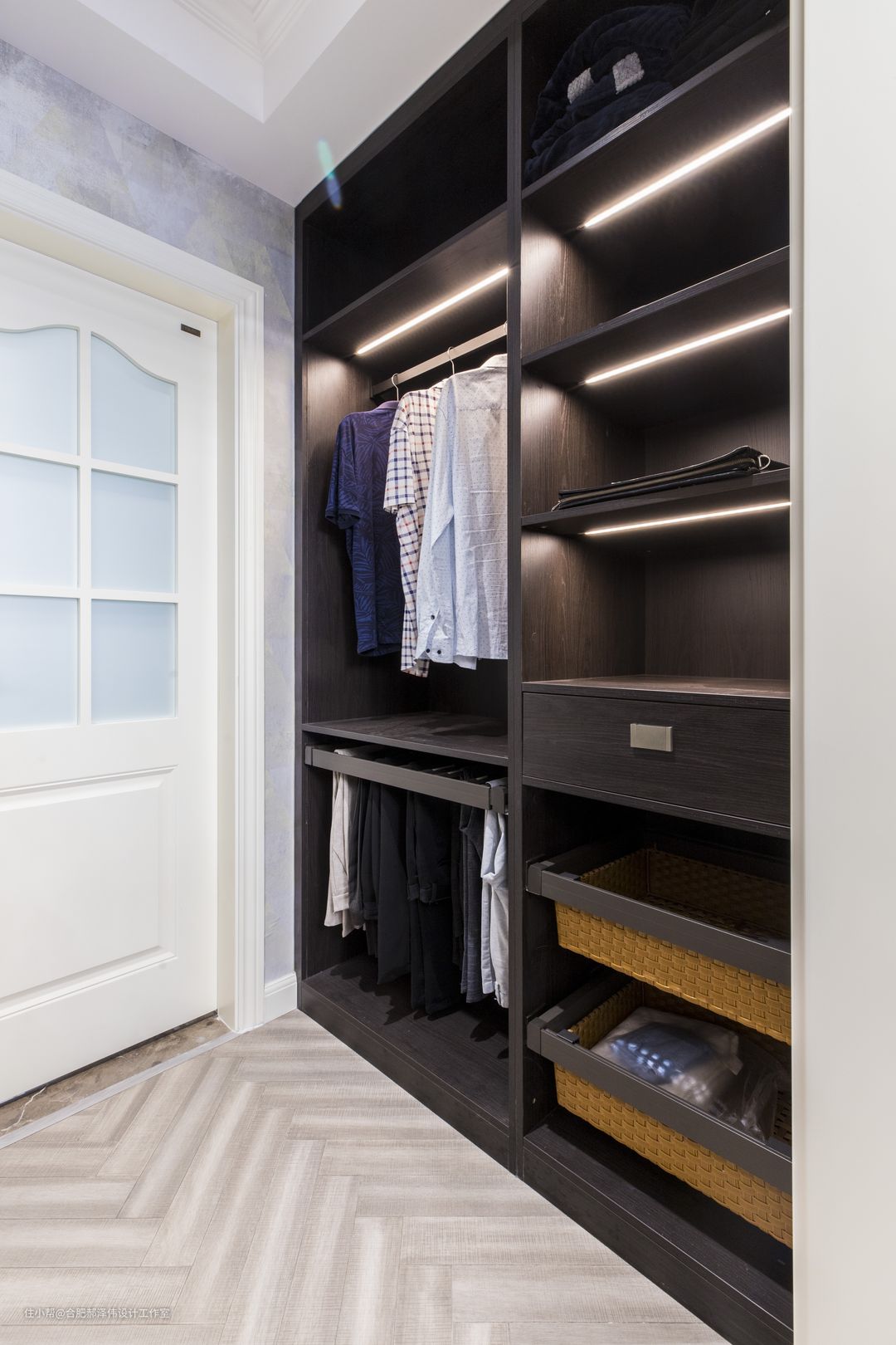 步入式衣帽间设计,考虑空间尺度和拿取衣物的方便性,未设计柜门。 双排衣柜设计,男女主人都有属于自己的独立衣柜。衣柜设计方面也考虑业主的生活习惯,(长衣+短衣+层板+抽屉+藤篮+裤抽+玻璃层板+灯带) 衣帽柜:法兰菲全屋定制
