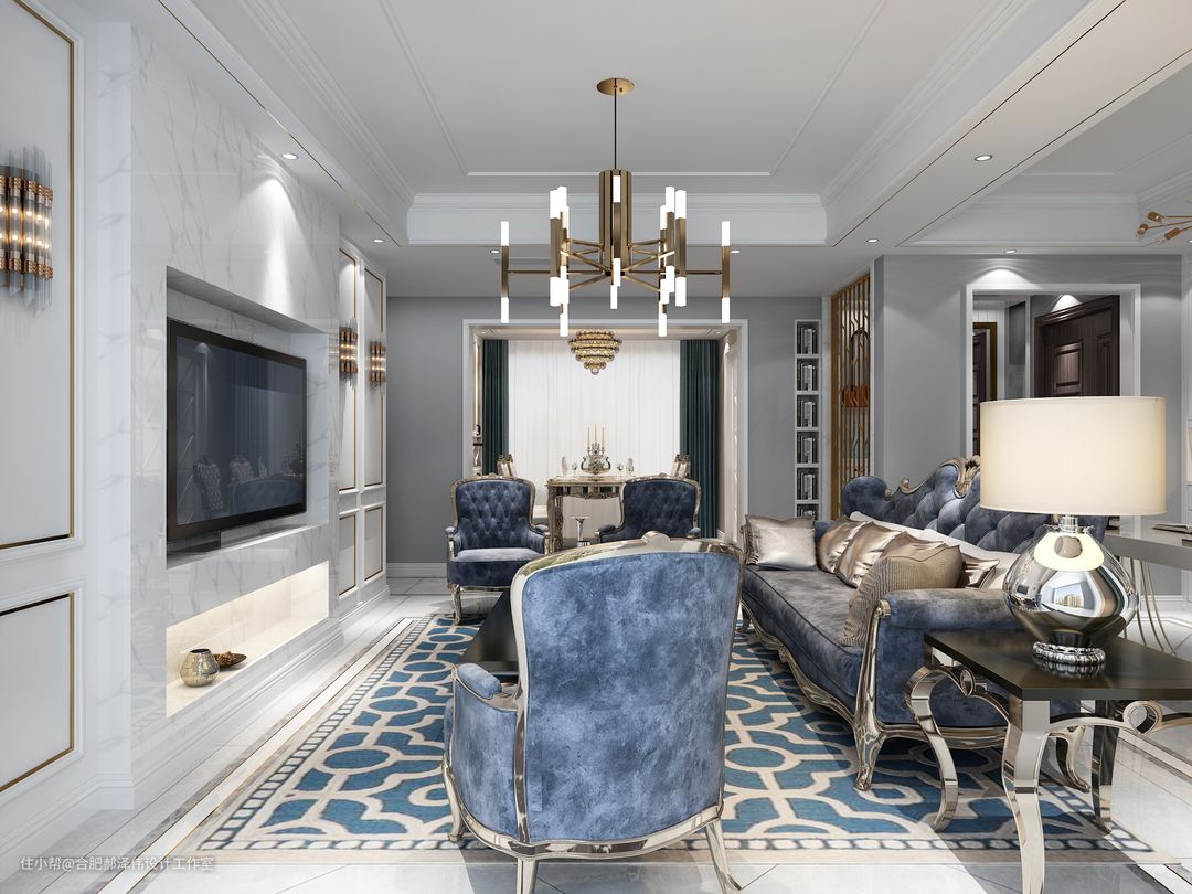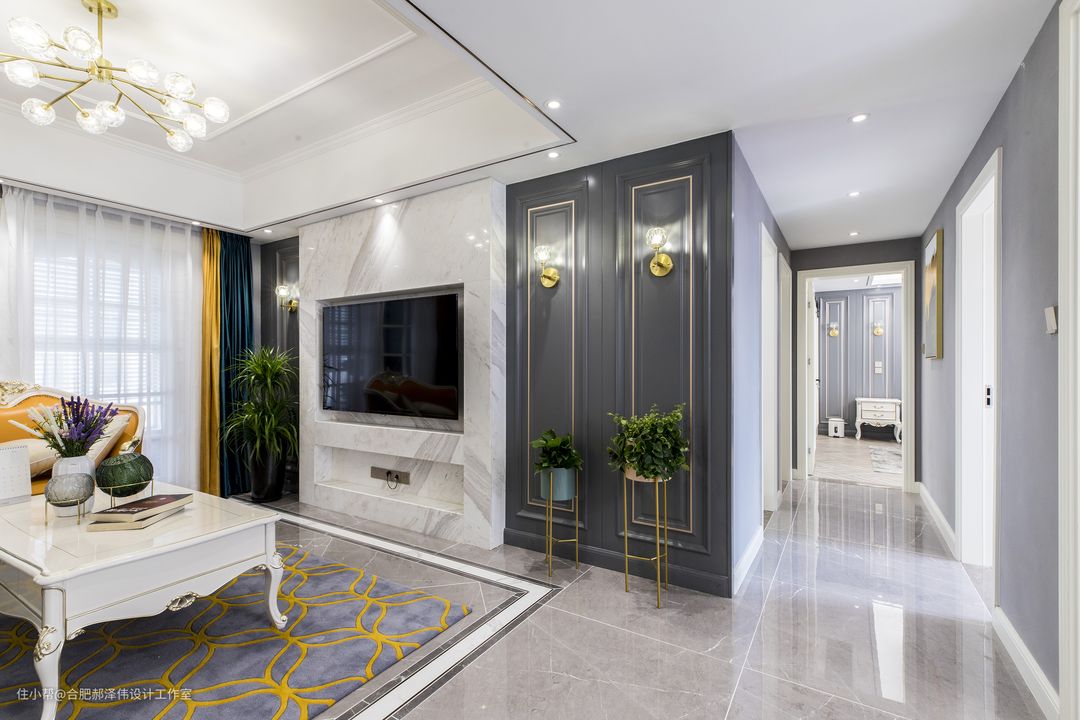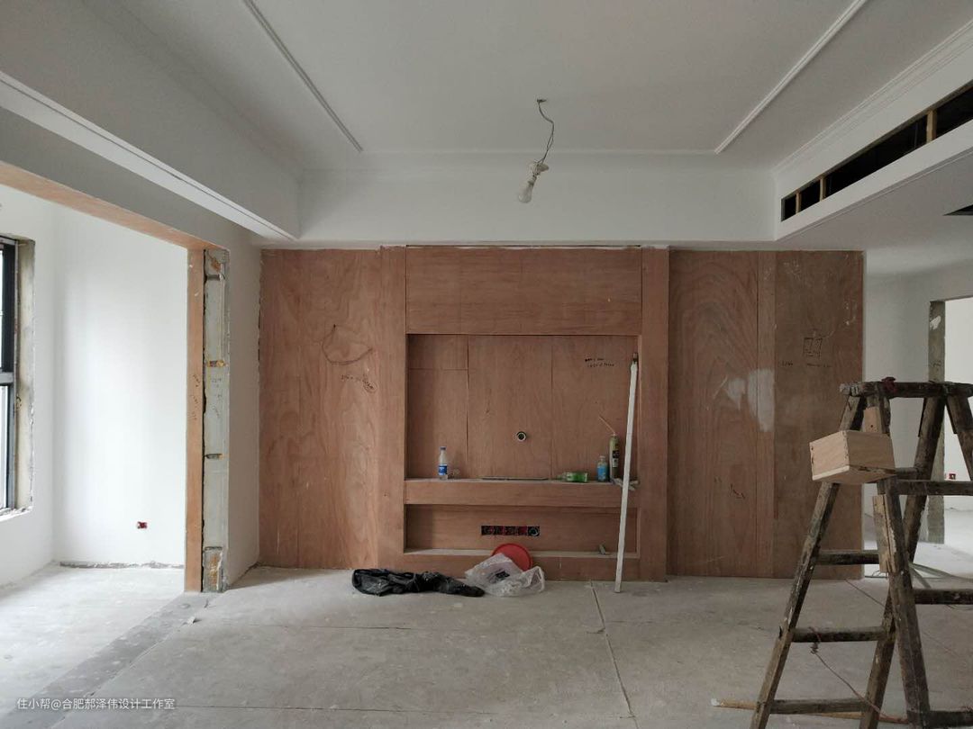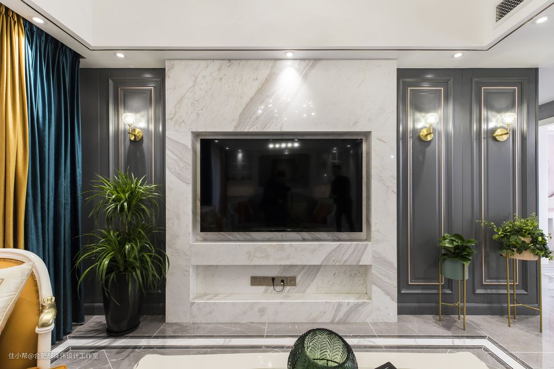 电视墙是整面细木工板打底。两边定制的护墙板,中间爵士白石材(老矿)。 地面的不锈钢卡条也和吊顶卡条的上下呼应,形成空间关系。