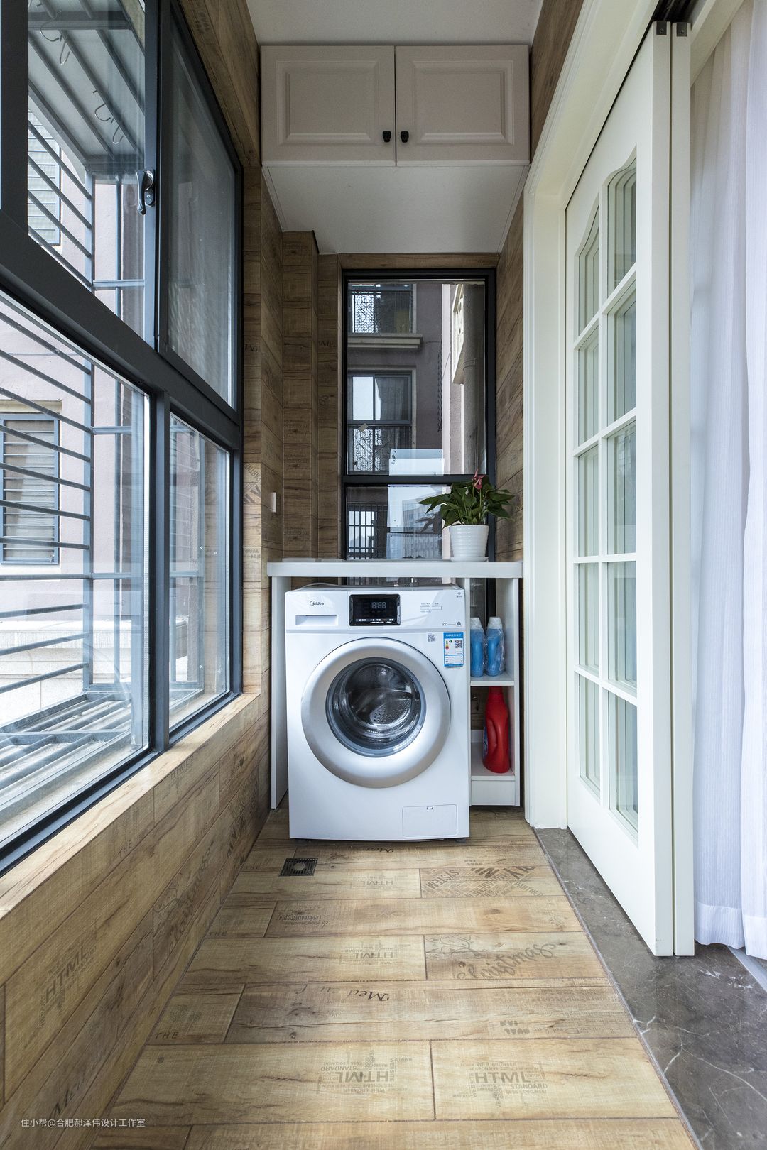 阳台洗衣机柜+吊柜,受管道限制,洗衣机外露了一部分。