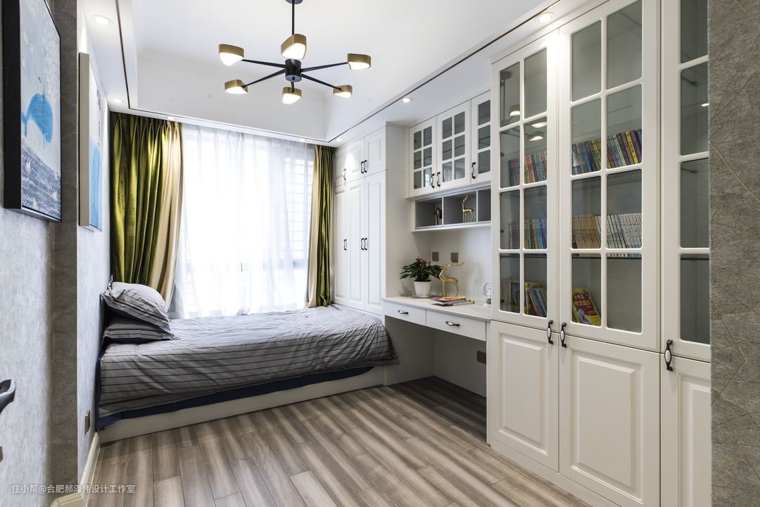 北面男孩房的房间我们将它设计成了榻榻米房,结合主卫和衣帽间个格局后,我们将榻榻米房的衣柜、书桌、书柜做在了一个平面上,整体感更强。
