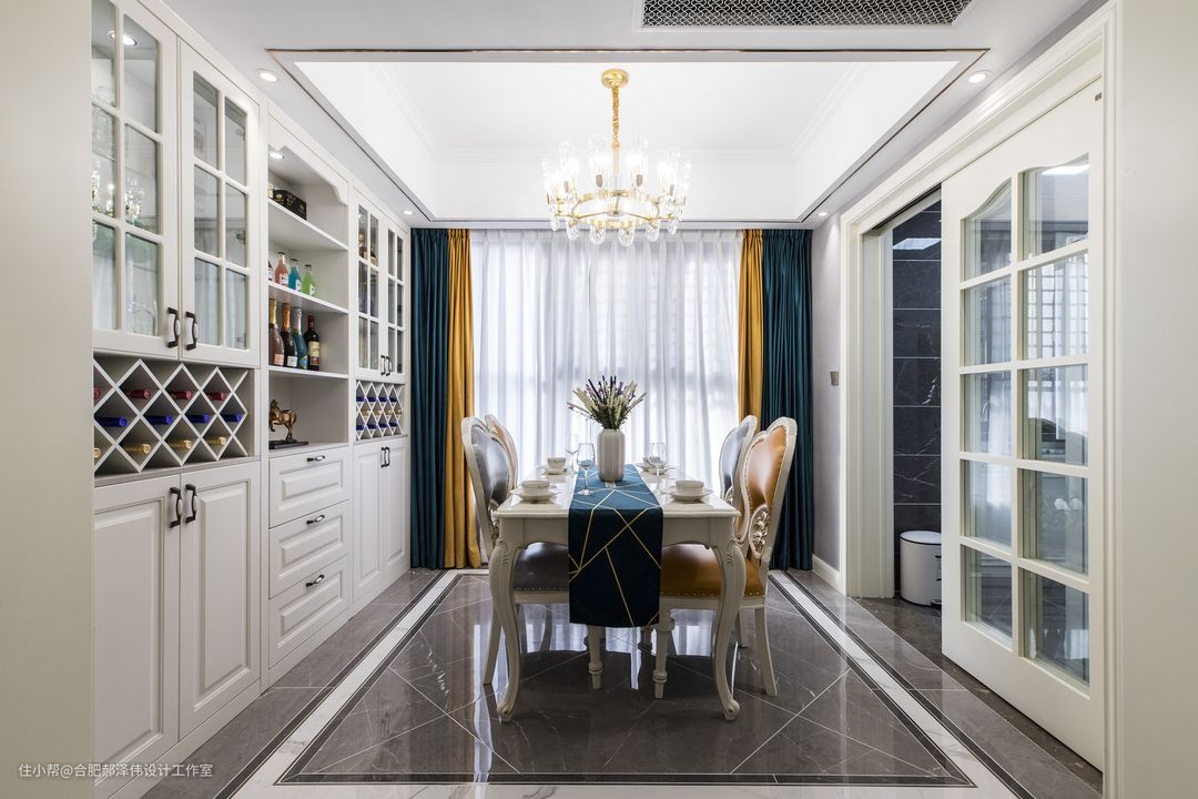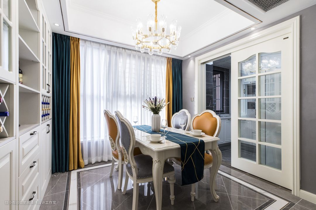 餐厅和书房空间対调,得来的是更大、更便捷就餐的餐厅空间。 顶地呼应设计、地面双色波打线+不锈钢卡条设计、定制酒柜满足储藏和展示功能。 窗帘同客厅款,墨绿色和橘黄色拼色设计,餐椅颜色选择同客厅沙发一致,没有选择4把同色,选择的2把灰色(呼应墙地)、2把橘黄色(呼应窗帘) 厨房木质玻璃吊轨门,没有地轨,后期清理卫生更方便。