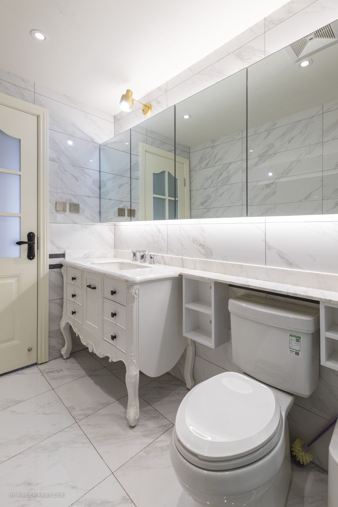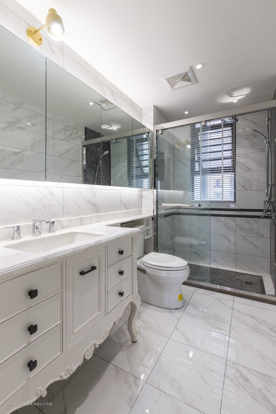 次卫(公卫)设计单面盆浴室柜+马桶+淋浴房 用色方面除了淋浴房部分全部白色爵士白瓷砖,瓷砖美缝选择的灰色带闪银的颜色。 墙面四周深色腰线增加层次,淋浴房地面做拉槽防滑处理。 按照淋浴房宽度的尺寸,包了个85*20公分的管道柱,柱子内部设计了壁龛,放置洗浴用品,花洒改到对面去,设计“一字型”淋浴房。 浴室柜柜门白色烤漆,台面天然爵士白大理石,和地面瓷砖一致。整面的镜柜设计超级大气好看,镜柜深度20公分和管道柱齐平。台面一直延伸的马桶上方,马桶上的台面也做20公分宽,齐平管道柱,没有突兀感。 镜柜上下灯带设计,洗手池上方设计镜前灯,灯带6000k色温,不建议用4000k或者以下的,不够亮。 顶面也做的硅藻泥。 瓷砖:冠珠瓷砖 瓷砖型号 白色:90002(900*900) 深灰:90018(900*900) 黑灰色:80110(800*800) 科勒卫浴 马桶:k-7769t 挂墙花洒:K-45352T-C4-CP