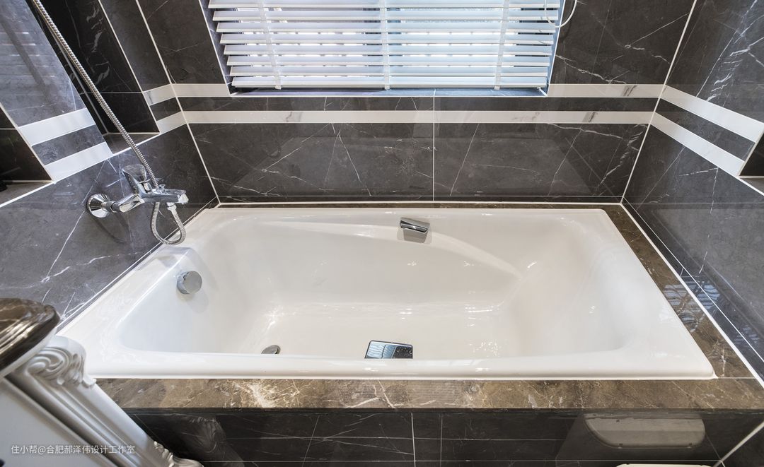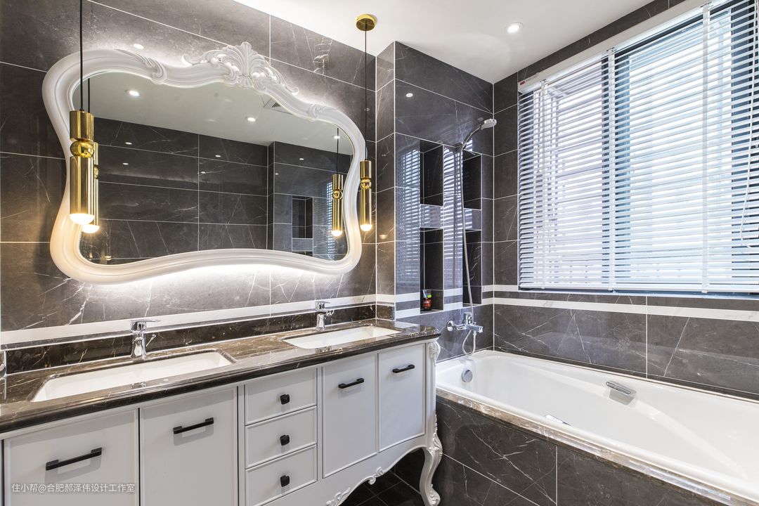 主卫设计双面盆浴室柜+壁挂马桶+浴缸组合。 用色方面深色瓷砖彰显档次,四周爵士白腰线塑造层次。白色美缝,跟瓷砖分开颜色,营造空间感。 为了追求更简洁美观的设计,顶面石膏板吊顶,腻子基层,进口硅藻泥饰面,没有做集成吊顶,射灯开孔位置不受局限。这种硅藻泥防水汽的效果要优于防水乳胶漆,顶面不容易受潮霉变。 浴缸右面的管道需要包柱,浴缸边上也需要有收纳洗浴用品的空间,结合在一起就在浴缸的左右都设计了壁龛,增加收纳空间,同时壁龛比五金挂件美观,而且更加安全,不易碰头。 男女主人希望可以有双面盆的设计,在原有的卫生间实现不了,设计后实现了这个愿望。以后早晨上班再也不用挣强洗面盆了。 浴室柜内部空间大,没有做镜柜。镜柜两边做了气氛单头吊灯,营造氛围。 台面的天然大理石找的最接近瓷砖颜色的石材。 瓷砖:冠珠瓷砖 瓷砖型号 白色:90002(900*900) 深灰:90018(900*900) 卫浴:科勒卫浴 马桶:K-5722T-S-0 浴缸:K-8277T-GR-0 挂墙浴缸花洒:K-7686T-4-CP