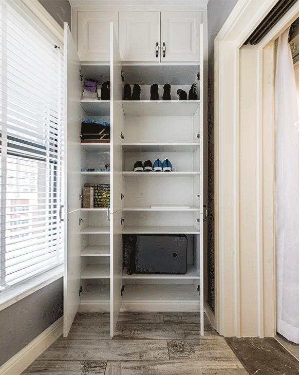 小书房的背面设计了一组到顶的储藏柜,当初的设想是作为换季鞋柜使用,现在看来的话算是一个储藏柜了。里面鞋子、工具箱、箱包、生活用品都可以放进去。 此类储物柜因为放置不同的物件,体积大小都不一致,所以建议适当设计一些活动的层板,通过抽拿层板来满足不同物品的收纳,可以看到图片中箱包的位置就是抽掉了一个层板。