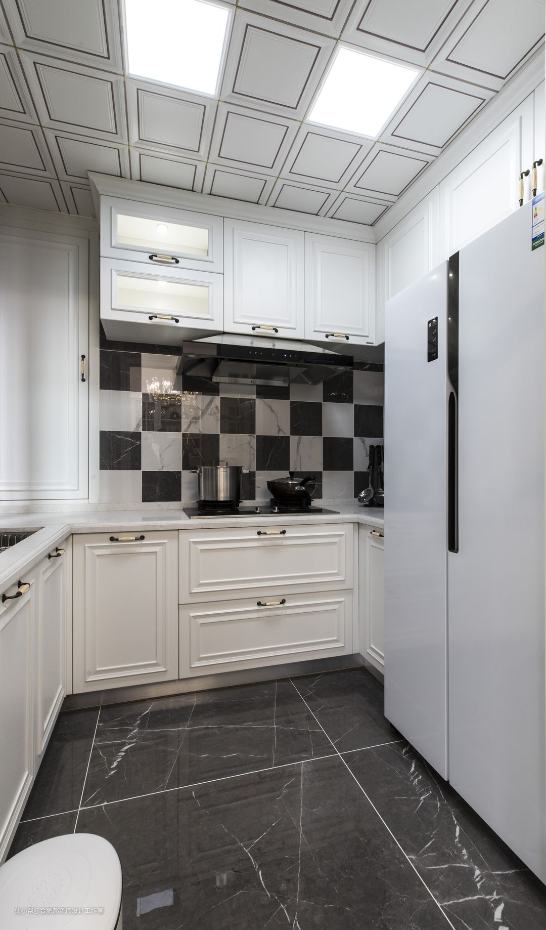 重新调整后的厨房,从原门洞进入厨房,厨房呈现竖长型,无法设计U型橱柜,只能设计L型橱柜,也无法实现对开门冰箱的需求, 更改了进门位置后,实现U型橱柜,增加了台面的,有足够尺寸放置双开门冰箱。同时也预留了电饭煲、微波炉、切菜板的位置。 厨房整体配色灰白配,灰色墙地砖,白色橱柜+电器+吊顶。 灶台背面的瓷砖花了点小心思,用900*900的瓷砖水刀加工成150*150后,跳格铺贴的,完成后效果客户很满意。 瓷砖:冠珠瓷砖 瓷砖型号 白色:90002(900*900) 深灰:90018(900*900) 橱柜:志邦橱柜