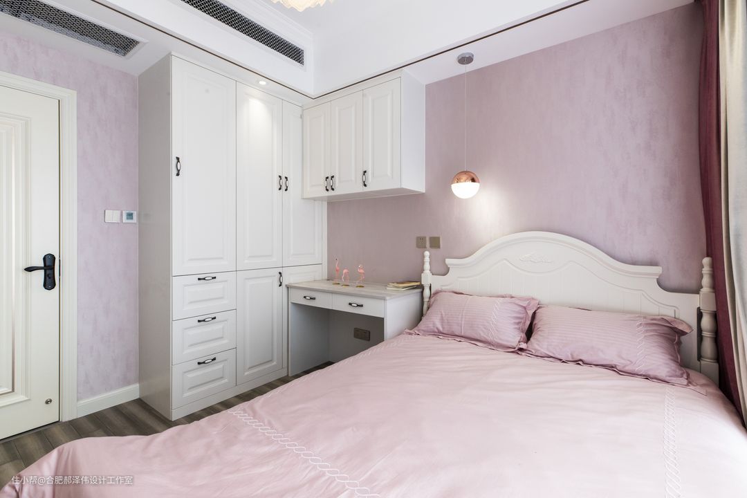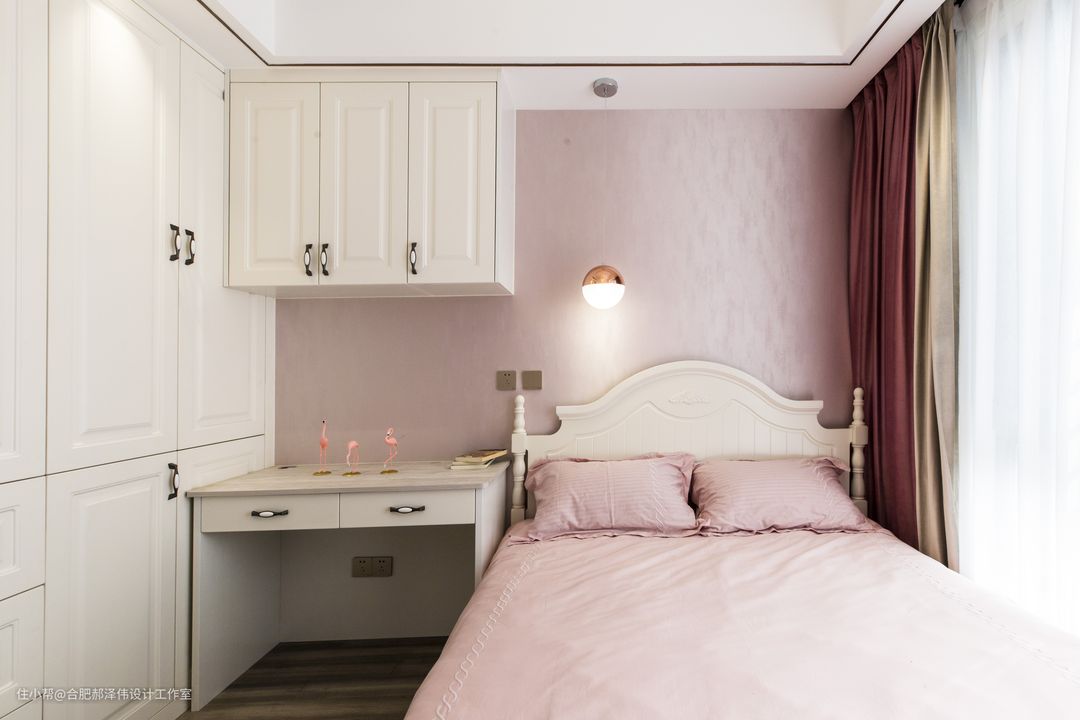 南面的女孩房,整个都是粉白的设计,粉色的四件套、粉色的窗帘、粉色墙布。白色家具。