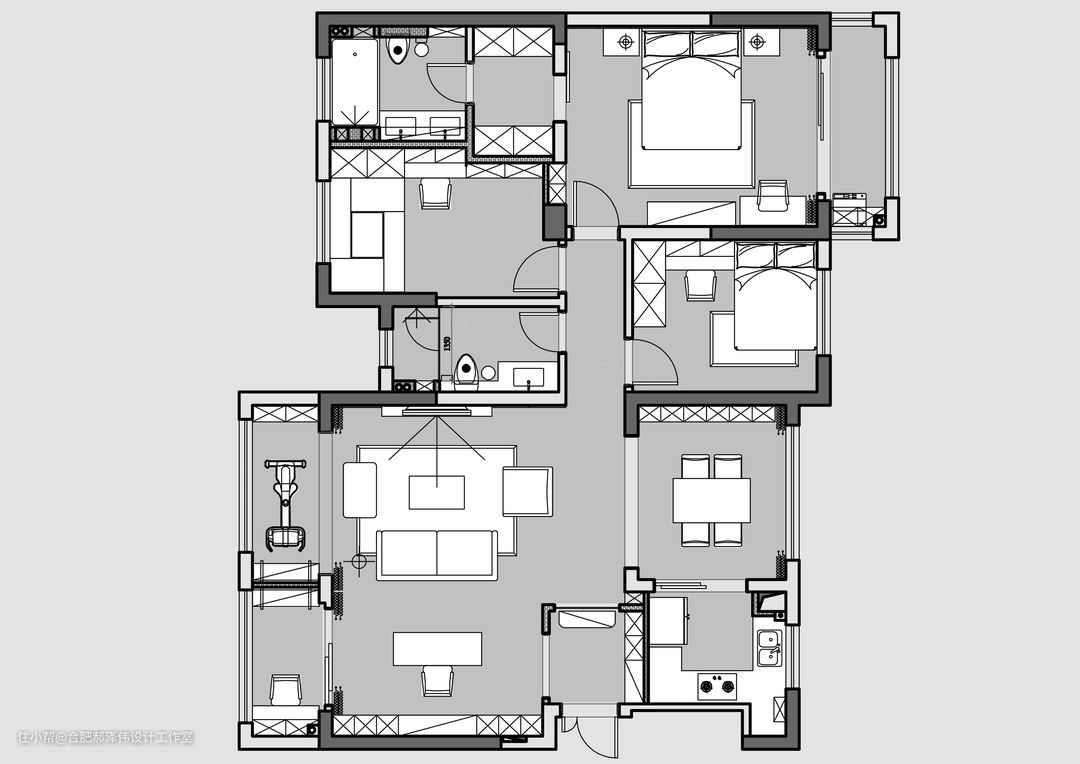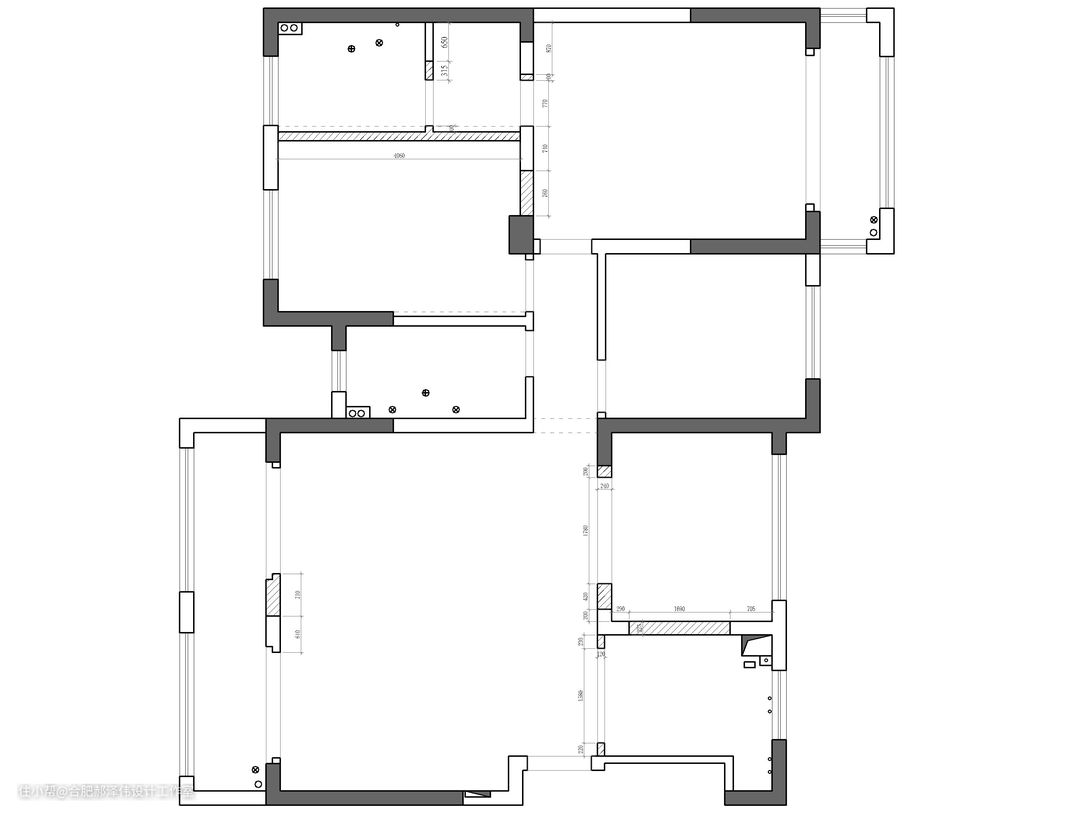 《墙体拆除图》 户型缺点:入户没有独立玄关、没有合理的鞋柜位置 大门直冲主卧室门,风水忌讳 原本“L形”厨房格局不合理、设计双开门大冰箱后,会导致台面过短,操作空间不足 原始客餐厅一体,并且朝北,空间有限,格局尴尬 主卧室套房舒适性不够,衣帽间小,收纳空间不足,主卫格局不合理,宽度不足,无法设计标准浴缸和双面盆浴室柜。