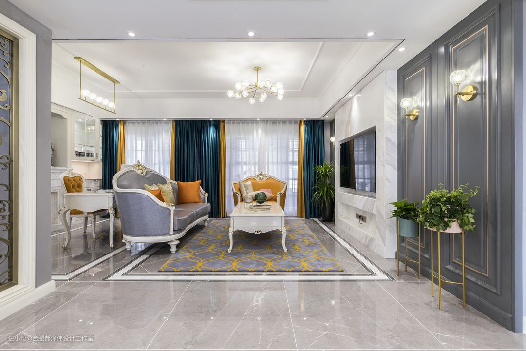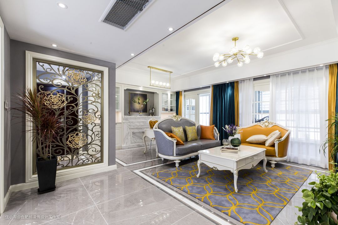 地面通体瓷砖灰色略浅,墙面和家具的灰色略深 公共区域的墙面都是灰色硅藻泥,窗帘为制定,客厅和餐厅为墨绿色+橘黄的配色。 窗帘材质为意大利绒布,这种布料手感好、有光泽、布料垂感好、遮光度也很好,就是价格偏高。比一般棉麻的贵2-3倍。 成品家具去看了3天,去了红星和居然,这种类型的家具都是10万+起步,业主和我都表示溜了溜了,后来找到一个小家具城,给了其他家看中款式的图片,找到同款,5万+搞定的。 沙发: 主沙发选的是灰色(和墙地配色),单人位是橘黄色(和窗帘配色)。不同材质的颜色是很难一点色差都没有的,我找的都是色差最小的颜色。 地毯: 找美凯龙的一家厂家定制的,选择的这个款式,然后挑选的颜色,背景色是灰色,内部线条是黄色。 这样的好处是整体看起来其实很舒服,不会觉得很突兀,但是其实又跟其他物件有穿插和关联。