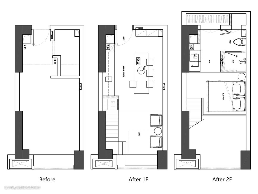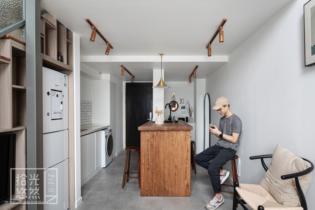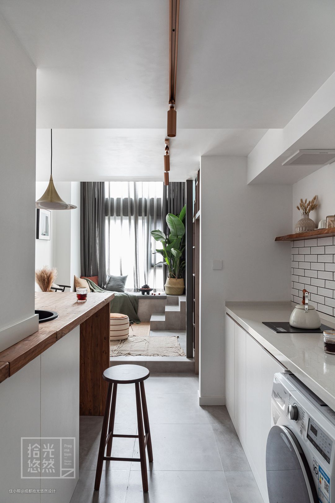▂ 屋主需求Ⅰ ● Demand 1. 层高4.8米LOFT公寓,套内面积仅20平米,单面采光,东北朝向。 ● Solution 1. 利用4.8米层高搭建了二层空间,将客厅规划到窗前,并做了挑高处理,联系起两层空间,也将采光无阻碍的引入室内。 ▂ 屋主需求Ⅱ ● Demand 2. 卫生间排污管位于中部,想拥有轻度使用的烹饪功能。 ● Solution 2. 将排污管包成方形,与吧台餐桌结合,并与橱柜一同组成开放式的餐厨空间,满足轻度餐厨功能需求。 ▂ 屋主需求Ⅲ ● Demand 3. 可满足使用者娱乐、餐饮、休闲、轻度工作,满足使用者中短期的舒适居住。 ● Solution 3. 一层整体为“动区”,使用者各种娱乐活动可以在这里进行,并与二层“静区”分离。