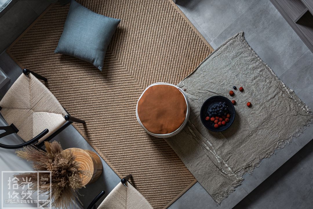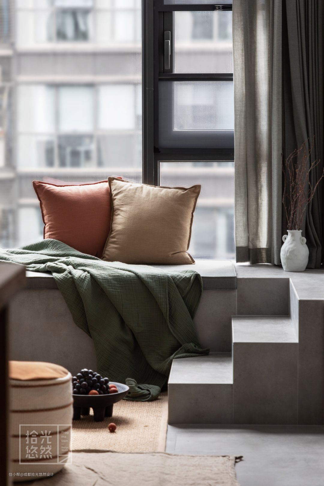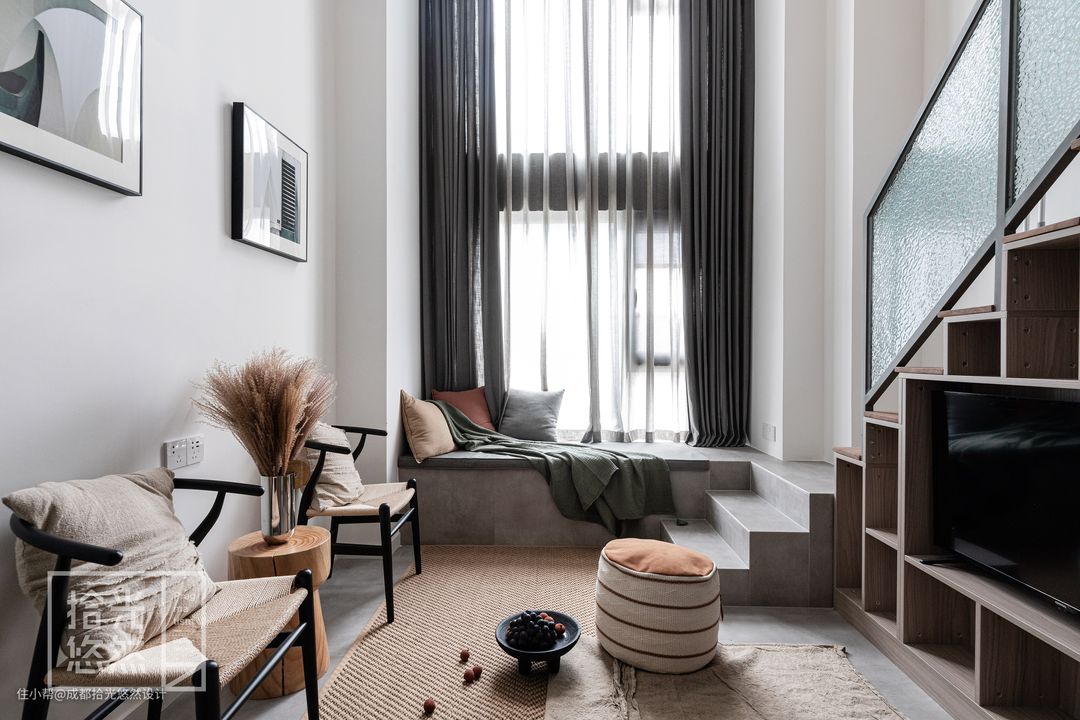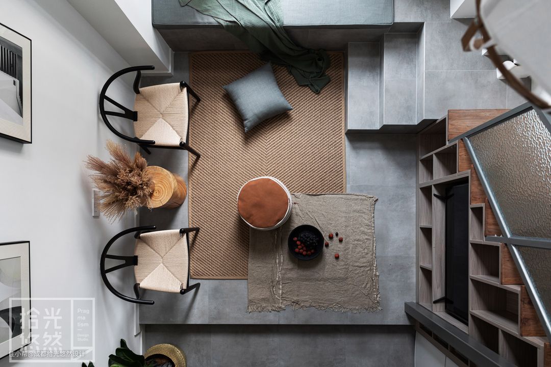 飘窗与沙发结合设计、联系上地台、带置物空间的楼梯的设计,界定出客厅的新范围,也减低了原本过高的飘窗的高度,让飘窗变成了舒适沙发。 从俯视的角度看客厅全局,两把具有东方气质的黑色Y chair与剑麻地毯、脏橘色坐墩,在客厅里围合成互动性的休闲空间。