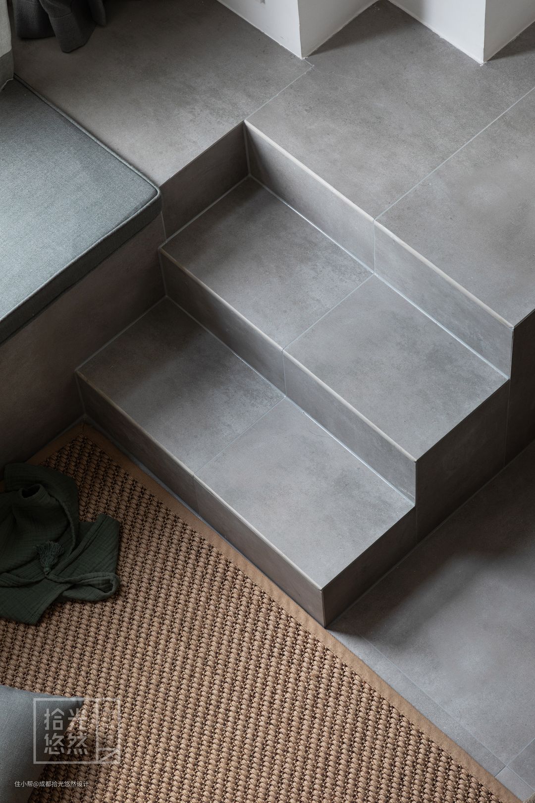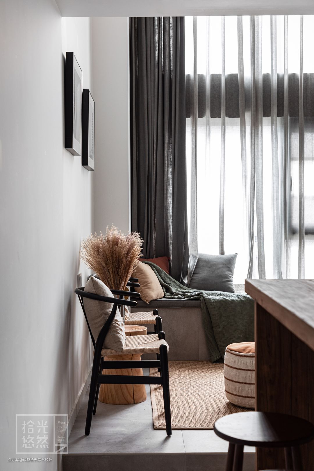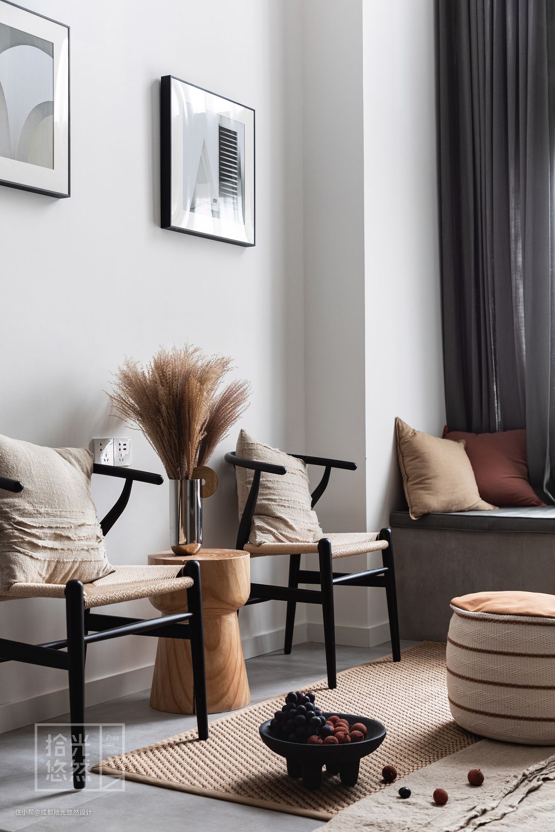 飘窗与沙发结合设计、联系上地台、带置物空间的楼梯的设计,界定出客厅的新范围,也减低了原本过高的飘窗的高度,让飘窗变成了舒适沙发。 从俯视的角度看客厅全局,两把具有东方气质的黑色Y chair与剑麻地毯、脏橘色坐墩,在客厅里围合成互动性的休闲空间。