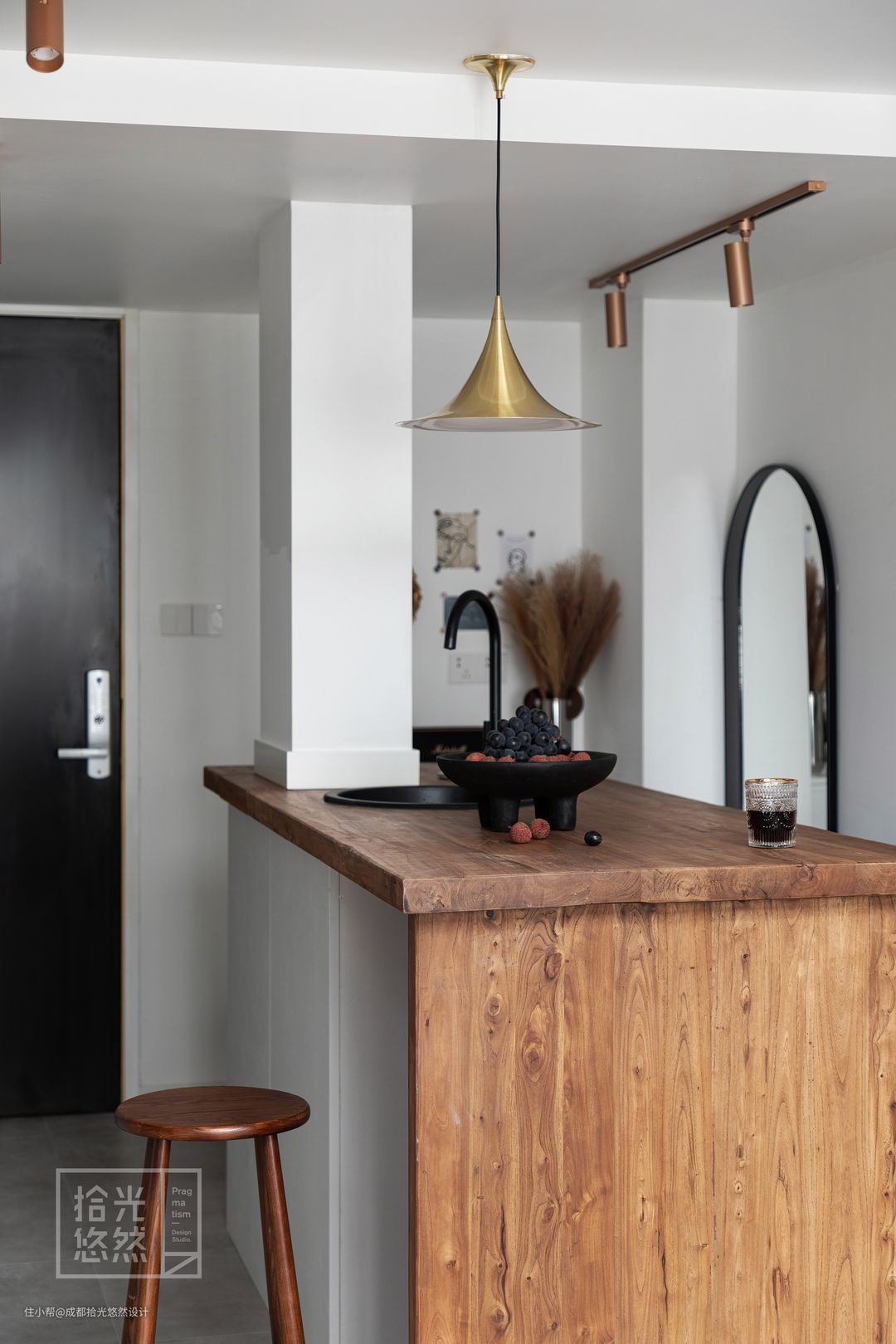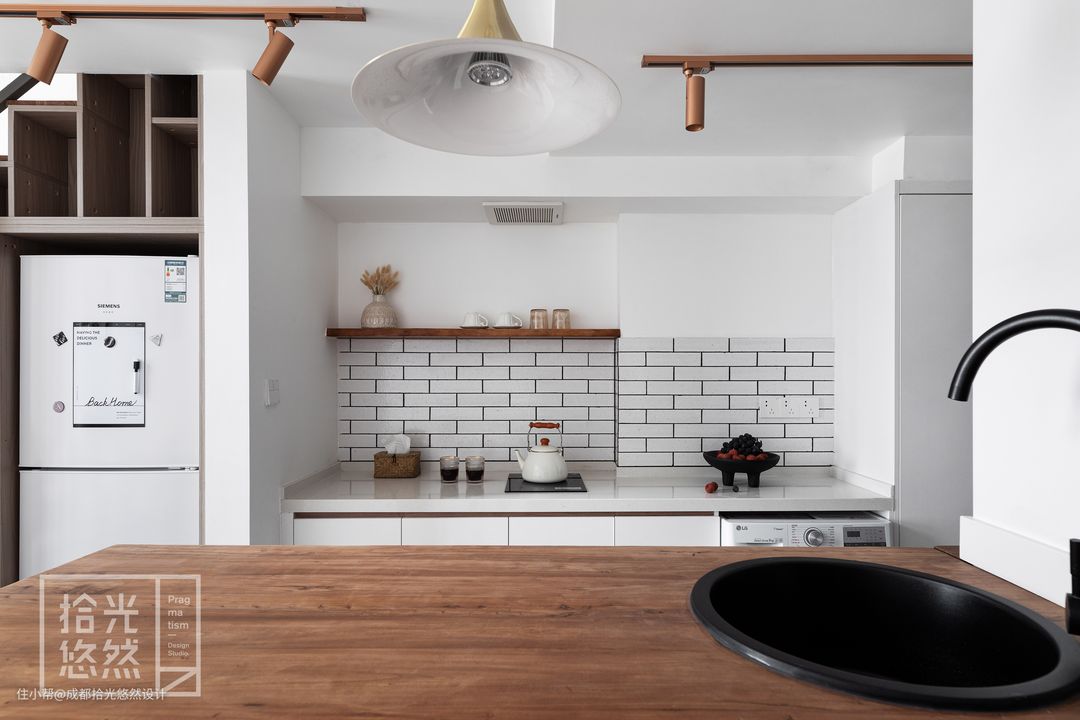 吧台与餐桌相互结合,小水槽就近设计在吧台上边缘,无论是吃一份简餐还是水果,有了它的存在就不用手忙脚乱的准备食材和清洗餐杯、水果了。 2.2M长的实木大吧台不止一日三餐那么简单,与小伙伴们开个party不在话下,还可以围着桌子来几局卡牌游戏。 吧台与对面橱柜一起组成开放式餐厨空间,满足使用者轻度餐饮,左边的冰箱门上,写着小两口对即将到来的客人的祝福与期待。