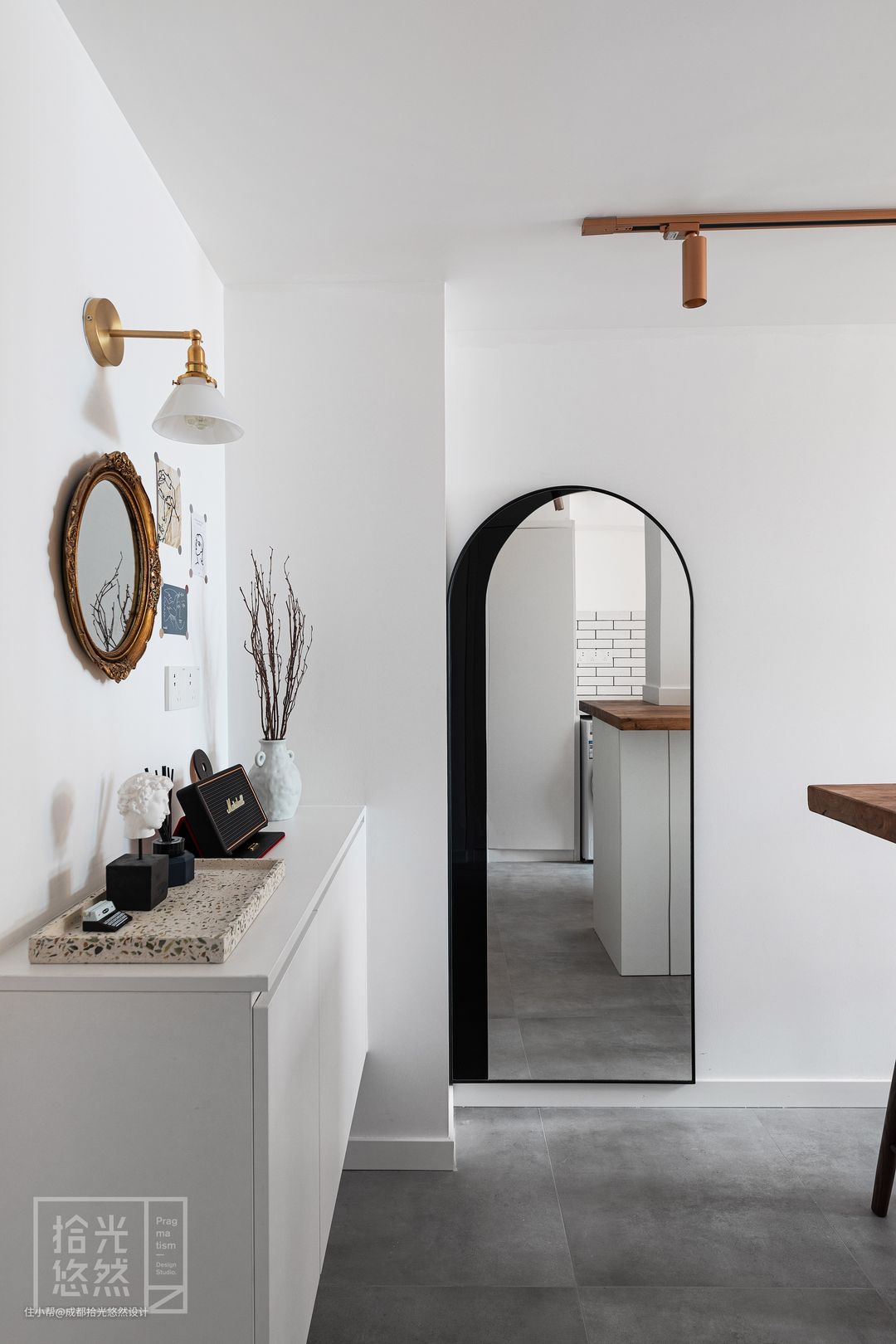 玄关鞋柜为壁挂式设计,悬空的鞋柜下考虑使用者进门便方便的完成脱鞋换鞋归置的一系列动作,保持鞋柜前通道整洁,哪怕是一间投资性公寓也要从私宅的角度考虑使用者的感受,这个容量可满足客人中短期居住的需求。 鞋柜旁边设计全身镜,无论是中长期自住时的日常生活、亦或是短途旅行至此的人们,这面镜子就是人们美好穿搭的记录者。