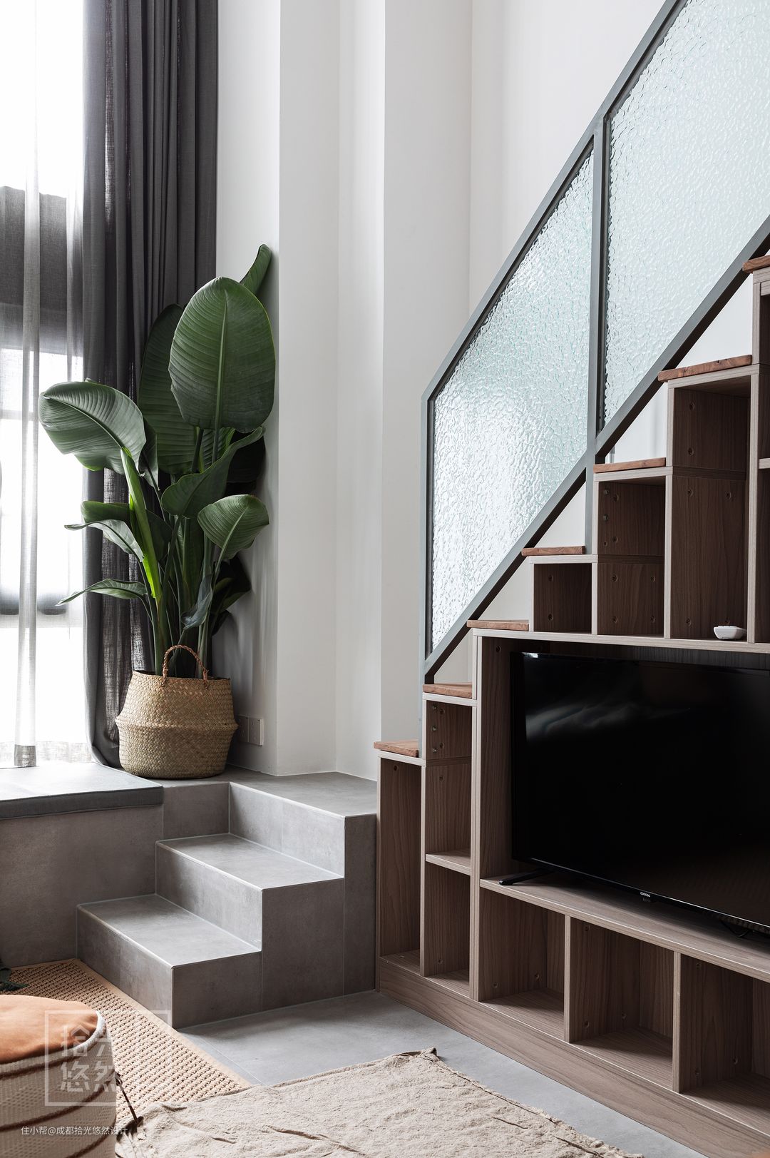 利用楼梯间隙设计的置物架,整体材质使用板材比起做储物柜性价比更高。在大小不一的置物柜中安装了电视,满足使用者观影需求。