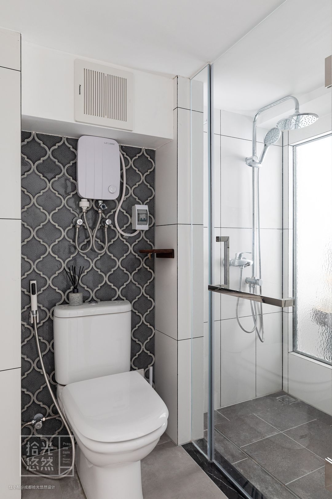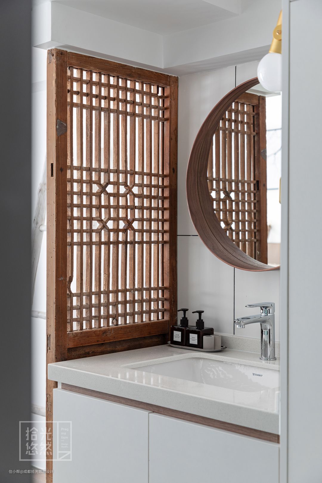 浴室柜旁的隔断是我们从二手市场淘回来的老门板,经过设计师“贾师傅”的一番巧手改造打磨成新的门板。 从废物摇身一变成了有颜值有故事的女(装)同(饰)学(物),为空间增加一番独有的东方气质。 淋浴间与睡眠区之间设计了一扇长条形采光窗,用锤纹玻璃阻隔视线,制造出犹抱琵琶半遮面的效果,让位于屋内的淋浴间也能有充足的自然采光,同时保证了使用者的隐私性。