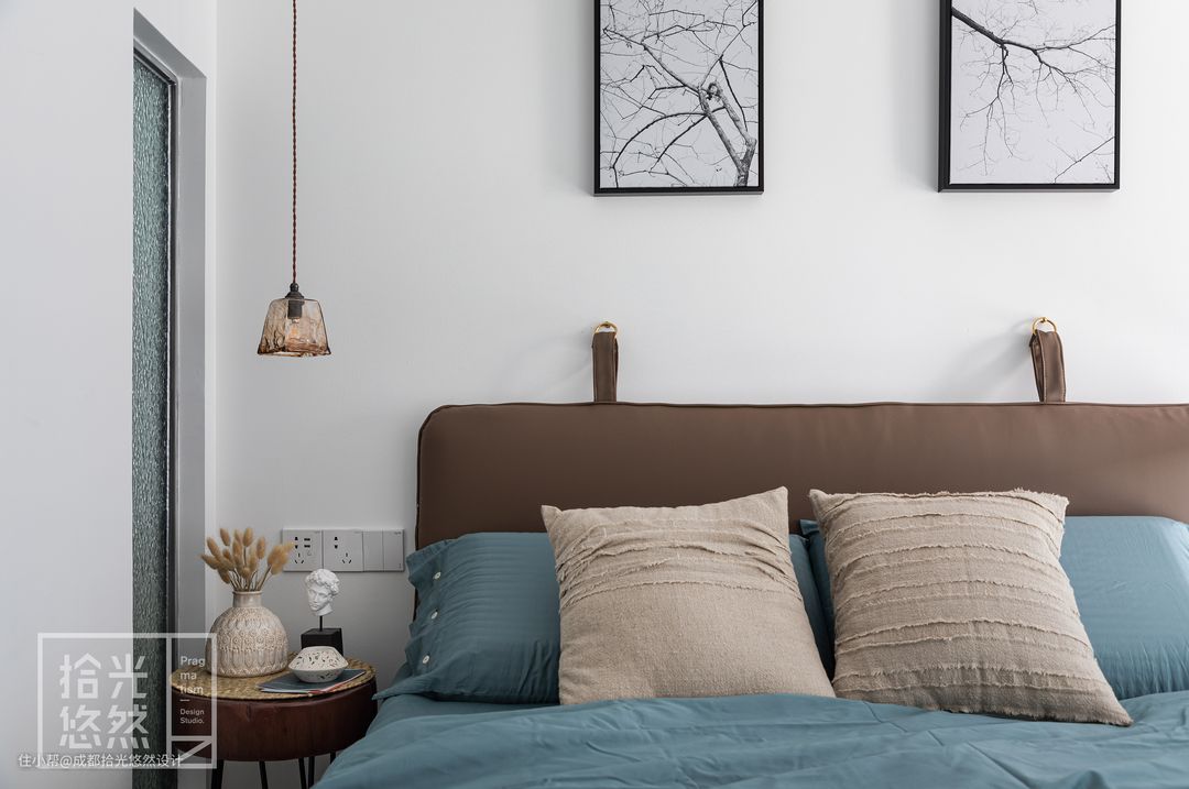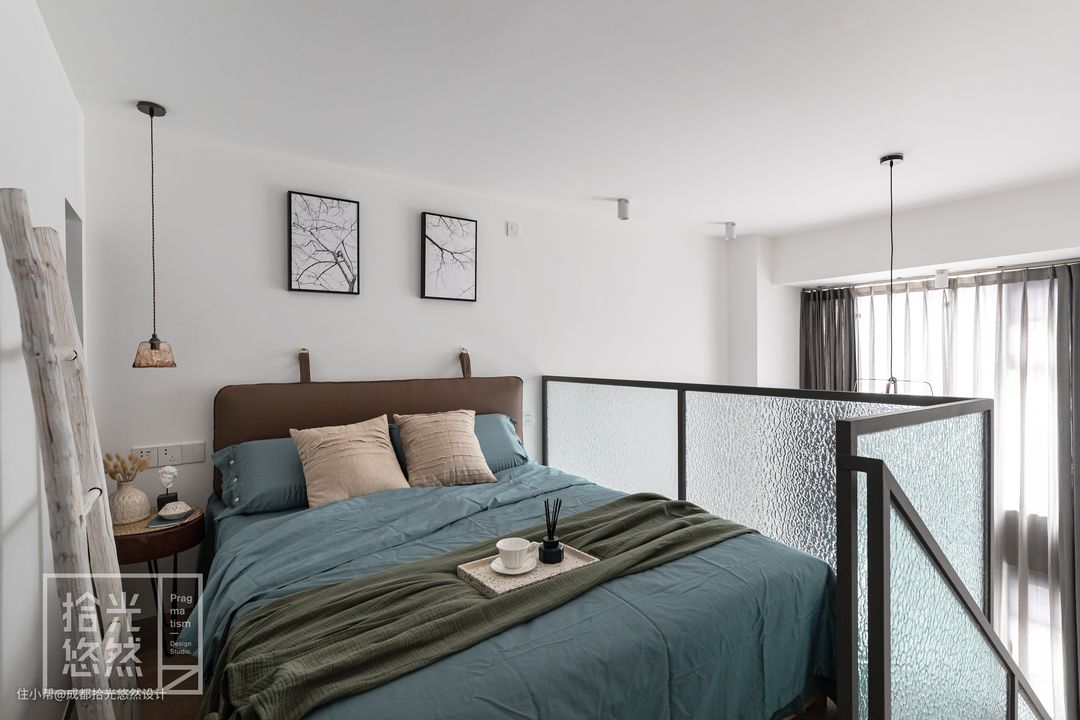 站在床边与处于一楼的小伙伴也能产生轻松地互动。 床头垂吊一盏复古茶色玻璃氛围灯,白天为睡眠区增色添彩,到了夜晚便行使它最原始的初心,包裹着夜色伴人入眠。