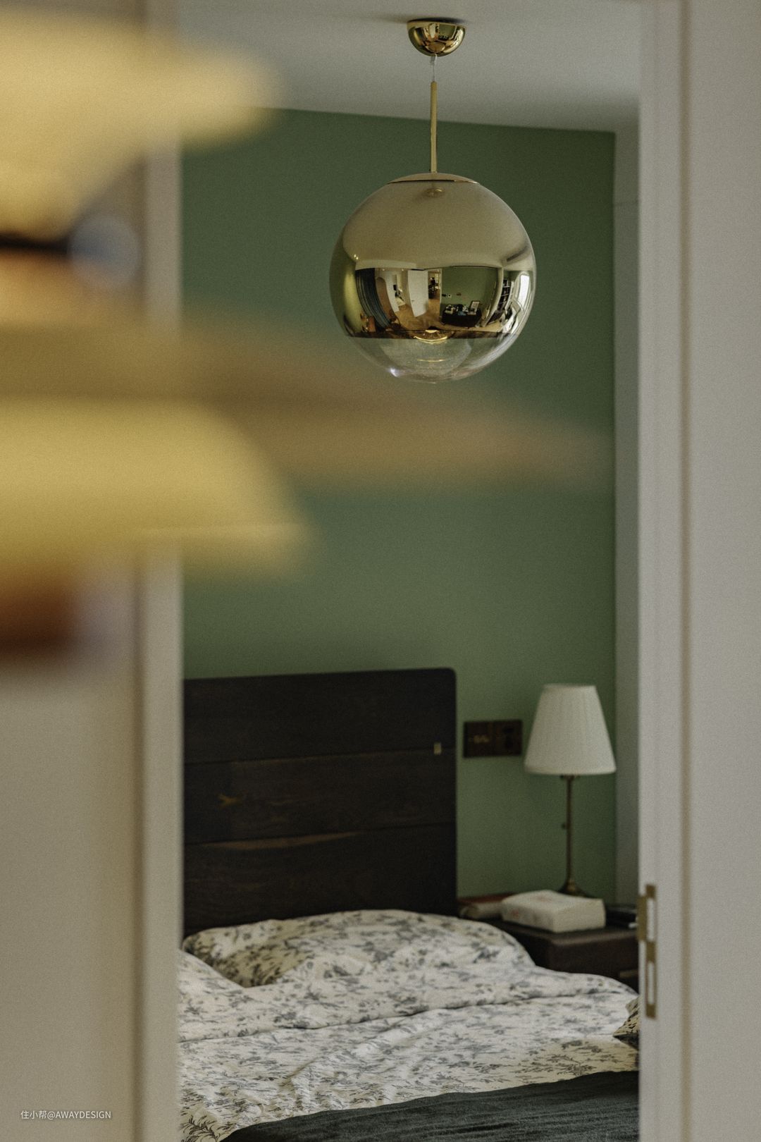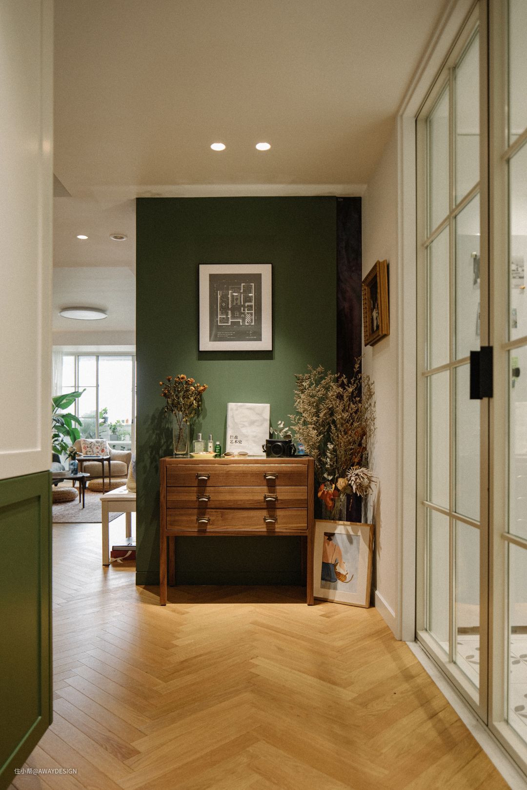 玄关空间除满足收纳功能外,也希望营造出归来的愉悦感。推开门,灯光亮起的那一刻,映入眼前的是整面绿色的对景墙,花束、装饰画、柔和灯光迎接主人步入自己的小小王国。