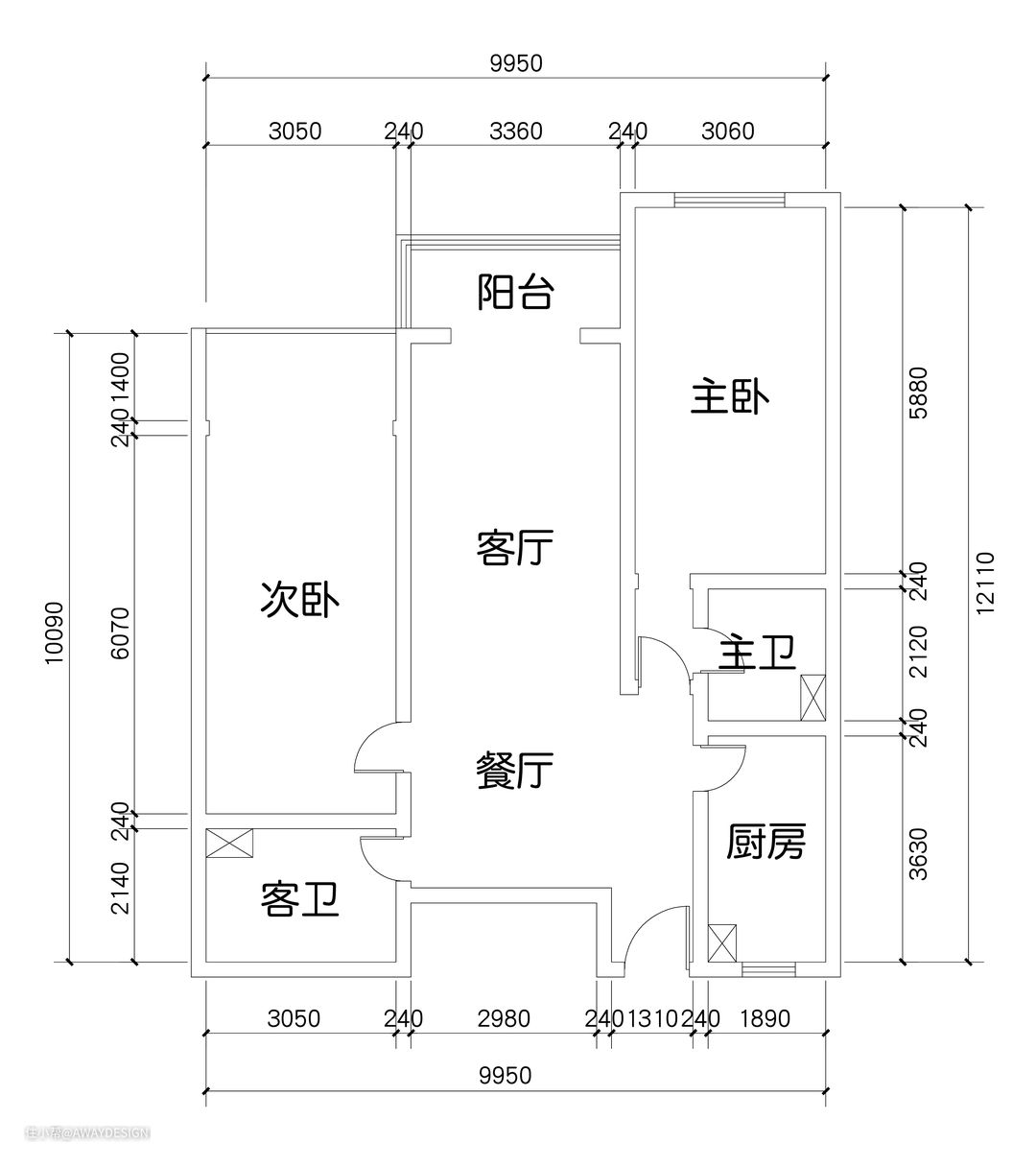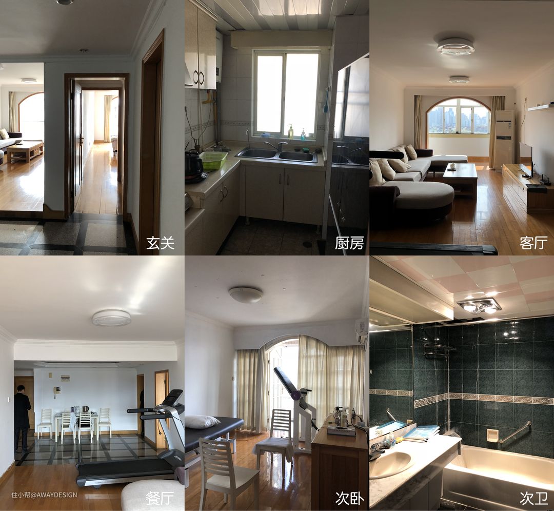 原户型为2室2厅1厨2卫,3开间朝南,北侧为公共过道; 入户正对卧室门,缺少玄关;厨房窗朝过道,采光有限; 餐厅东侧被客卫和次卧门撕裂,空间破碎,缺少围合感; 客厅及两个卧室空间狭长,其内部功能布置有较大限制; 两个卫生间,缺少自然采光,稍有不慎,便会显的拥挤。