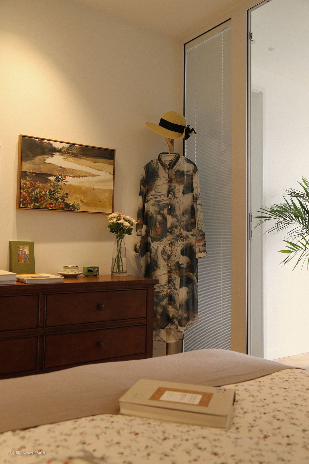 化妆镜中映射出床对面的斗柜画面,相框、画作、香氛、首饰盒均有玫瑰元素。
