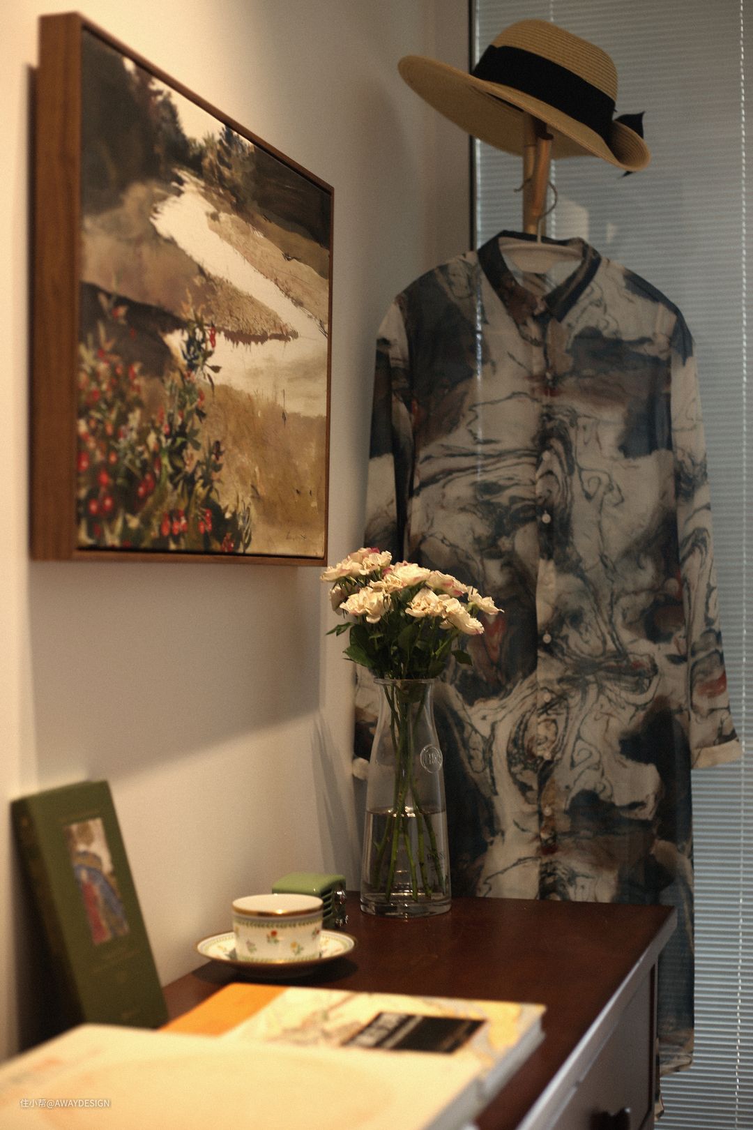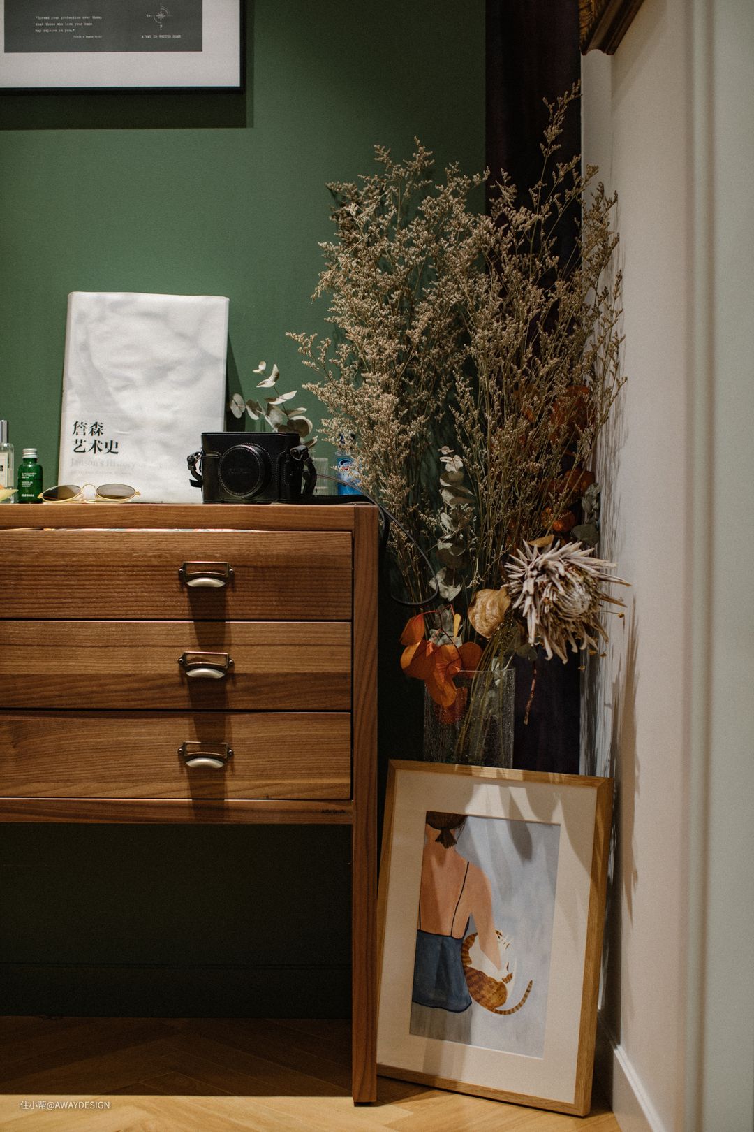 背景墙下放置了斗柜,来自 Norhor,台面可放置花瓶、装饰物,也可以随手放一些小件物品。