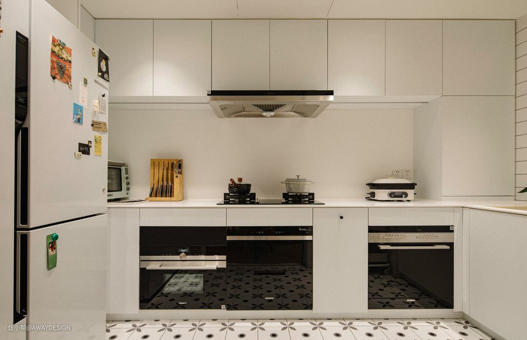 厨房以白色为主色调,营造明亮洁净的氛围,橱柜台面和背景板均采用杜邦可丽耐人造石,平面和墙面通体设计,实现了无缝拼接。